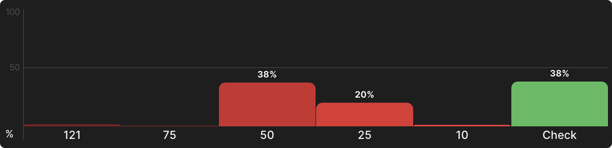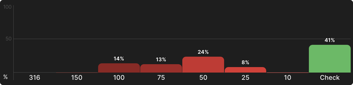 Мы наблюдаем аналогичный эффект, когда смотрим на BTN против UTG в глубине 40bb. SPR чуть выше 1, но BTN практически никогда не идет в олл-ин, предпочитая поддерживать геометрический рост со ставками в 25–50% банка: