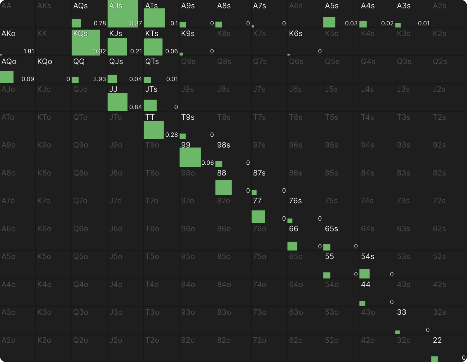UTG не будет делать чек-рейз очень агрессивно, как мы видим выше, всего в 10% случаев. Даже рука вроде AQo, топ-пара топ-кикер, будет, как правило, разыгрываться как чек-колл большую часть времени с небольшим процентом чек-рейза. Защита слабых частей нашего диапазона и блеф-кетч становятся более приоритетными, чем прямой сбор вэлью с нашими хорошими, но не лучшими руками.