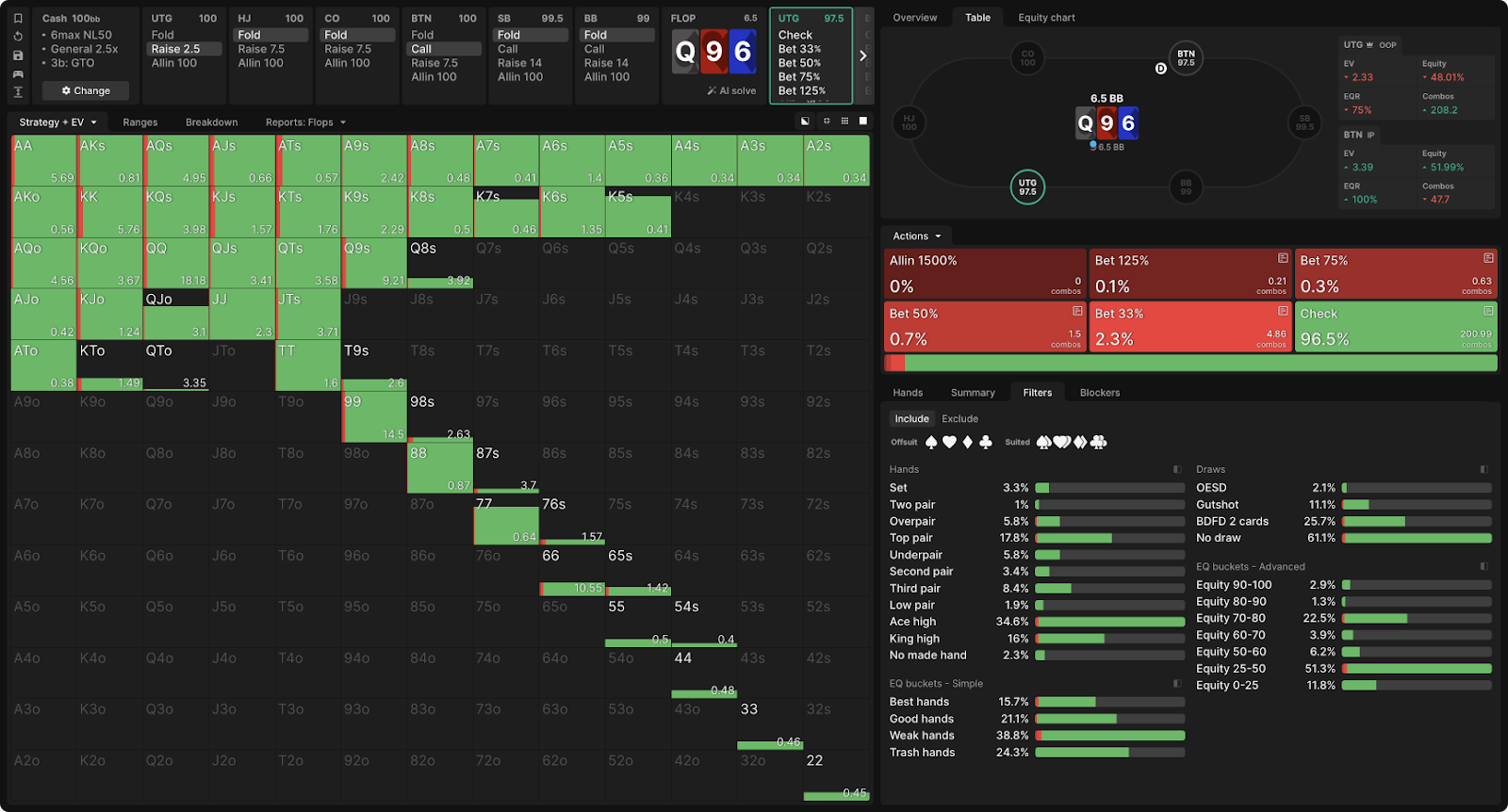 Недостаток того, что мы находимся вне позиции на протяжении всей раздачи, означает, что теперь нам нужно очень осторожно играть многие флопы. Даже на флопе, где UTG, кажется, стоит относительно хорошо, например, Q-9-6 радугой, нам лучше всего начать с чека. Диапазон BTN более сжат, что означает, что у него на самом деле более высокий процент сильных рук, чем у нас на таком флопе. Даже руку вроде топ-пары с топ-кикером предпочтительнее играть через чек-колл.