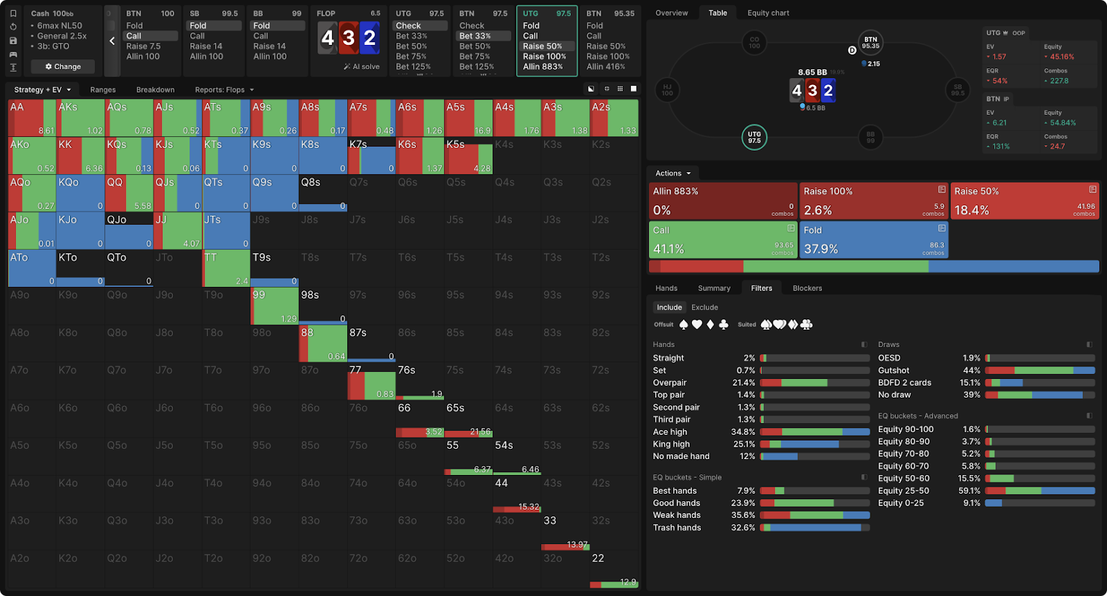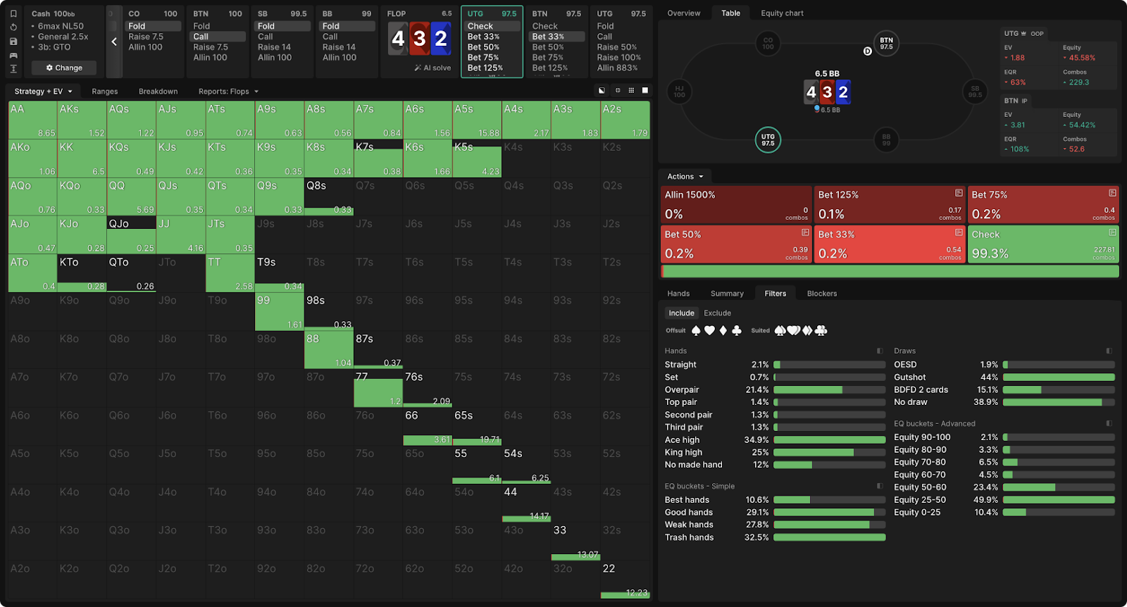 Мы неизбежно окажемся в неудобных ситуациях, например, когда мы повышаем из ранней позиции и получаем колд-колл от поздней позиции. Теперь мы должны играть весь спот без позиции (OOP). Несмотря на сохранение преимущества наличия большего количества натсовых рук на префлопе, то, что предлагает нам GTO, может быть нелогичным. В этой статье мы рассмотрим, на каких флопах мы можем продолжать быть агрессивными, на каких мы должны чаще делать чек, а также некоторые полезные практические правила, которые следует учитывать при игре с живыми оппонентами. В этой статье мы будем использовать решения солвера для кеш-игры NL50, глубина 100 bb, UTG открывает 2,5 bb, BTN делает флэт-колл.