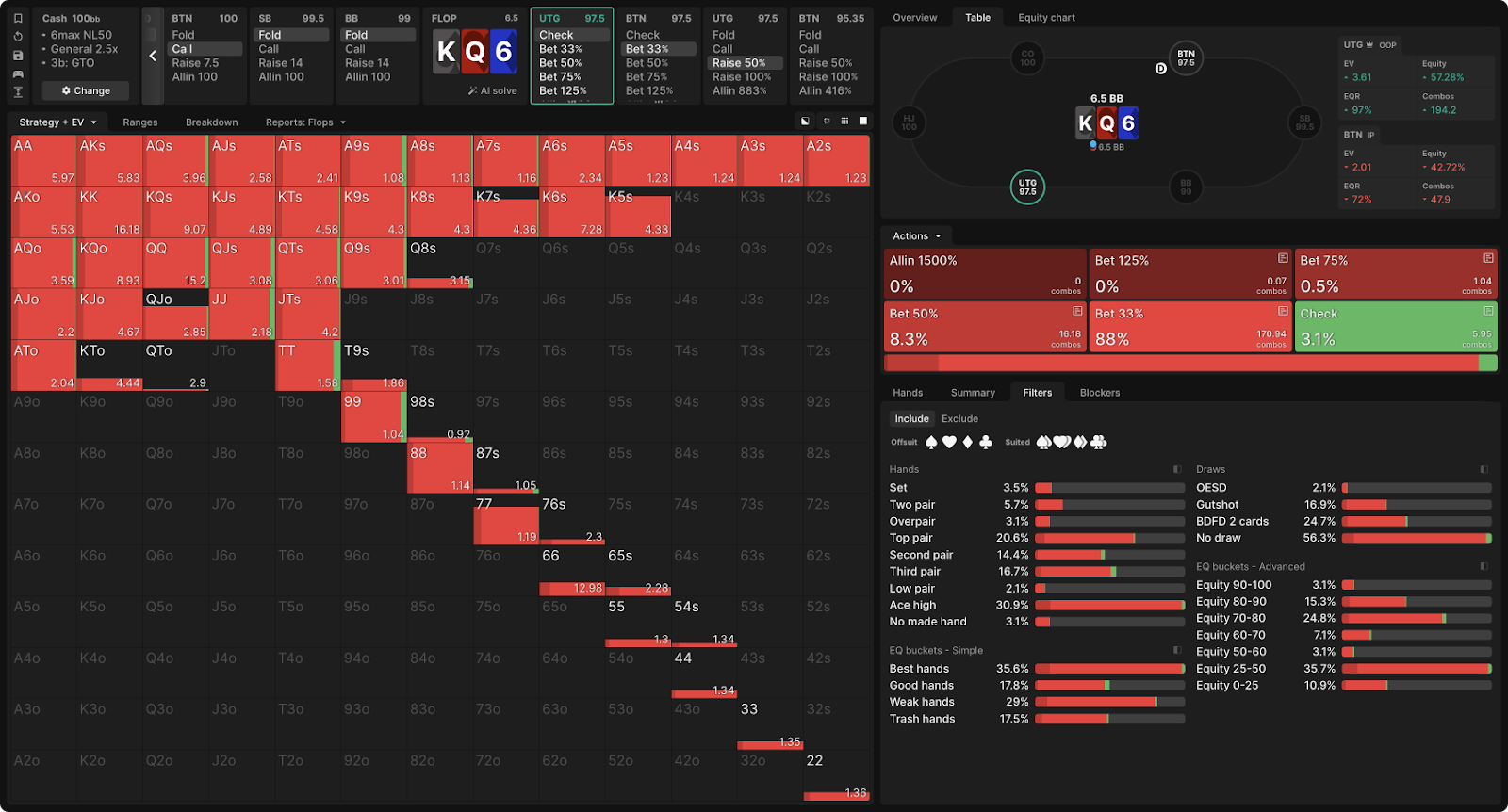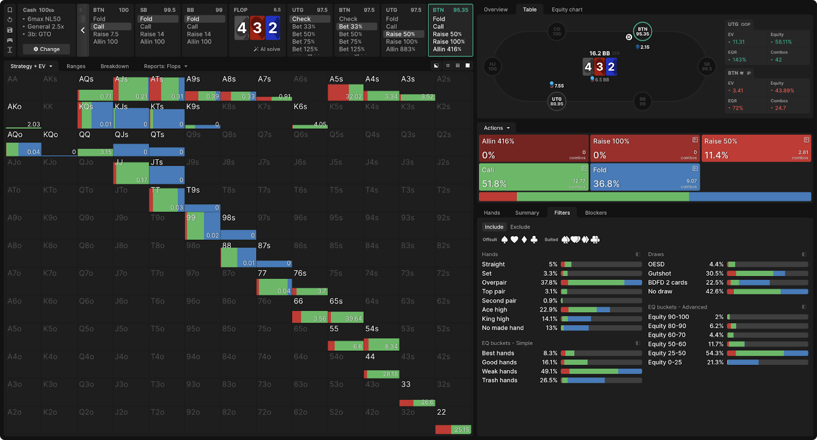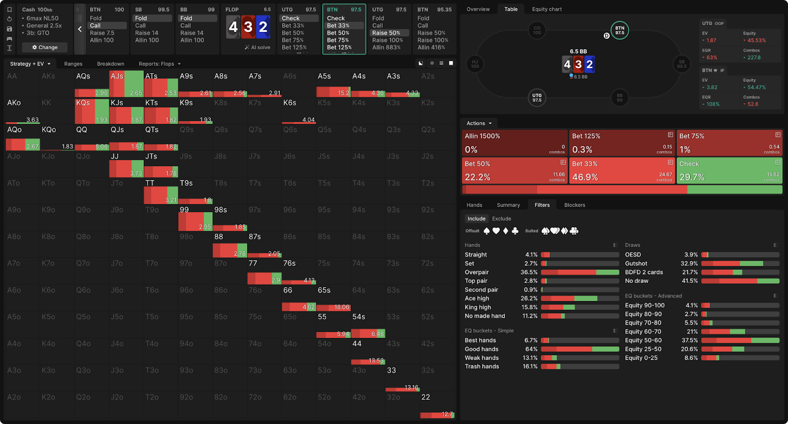 - Наконец, без каких-либо ридсов (заметок) на нашего оппонента, было бы хорошей идеей следовать рекомендуемой GTO стратегии, чекая, когда нам нужно чекать, и делая большую или маленькую ставку в зависимости от того, насколько хорош для нас флоп. Также будут ситуации, когда мы будем смешивать ставки и чек. Хорошо отработать эти ситуации в специальном тренажере солвера.