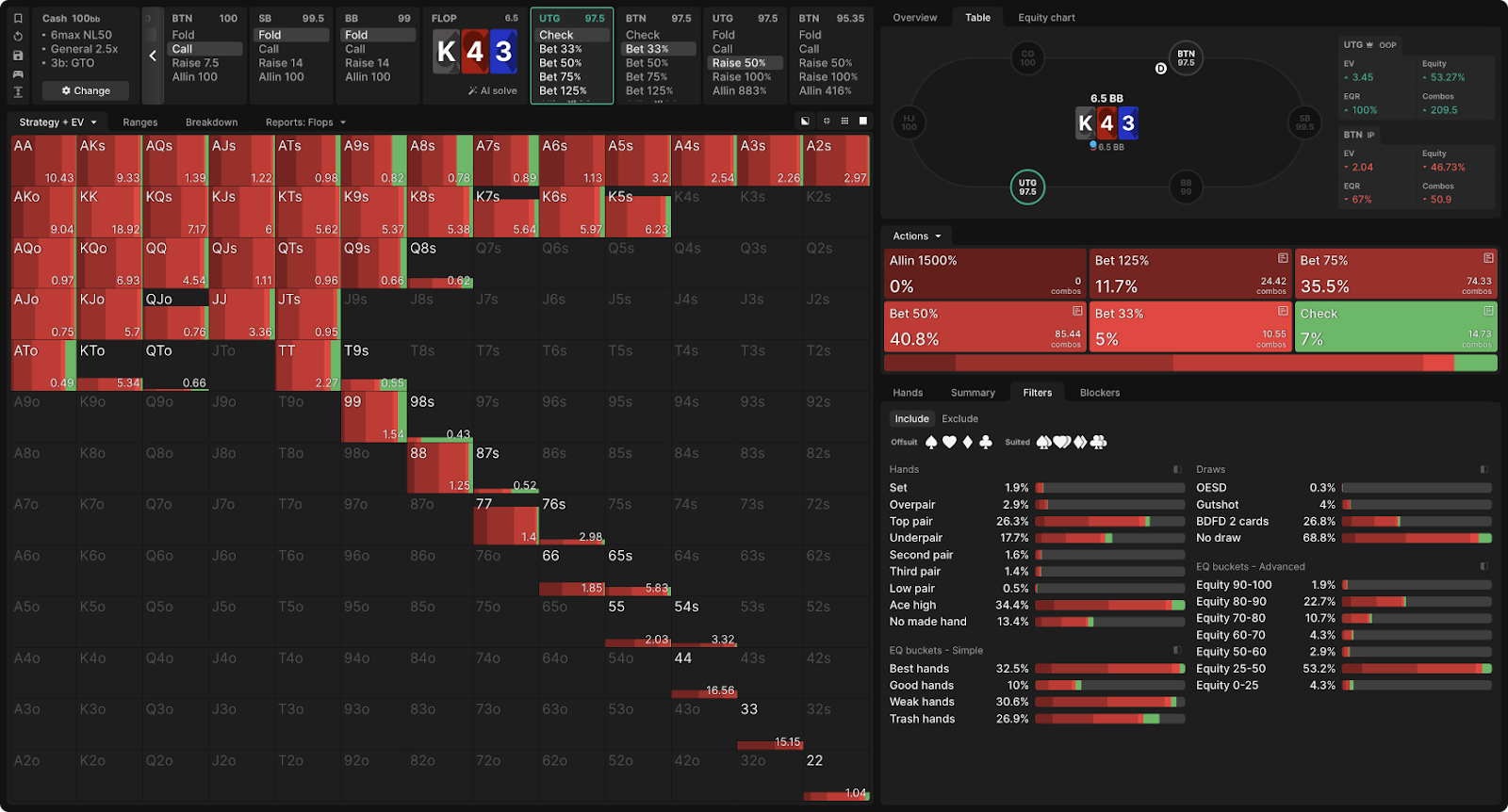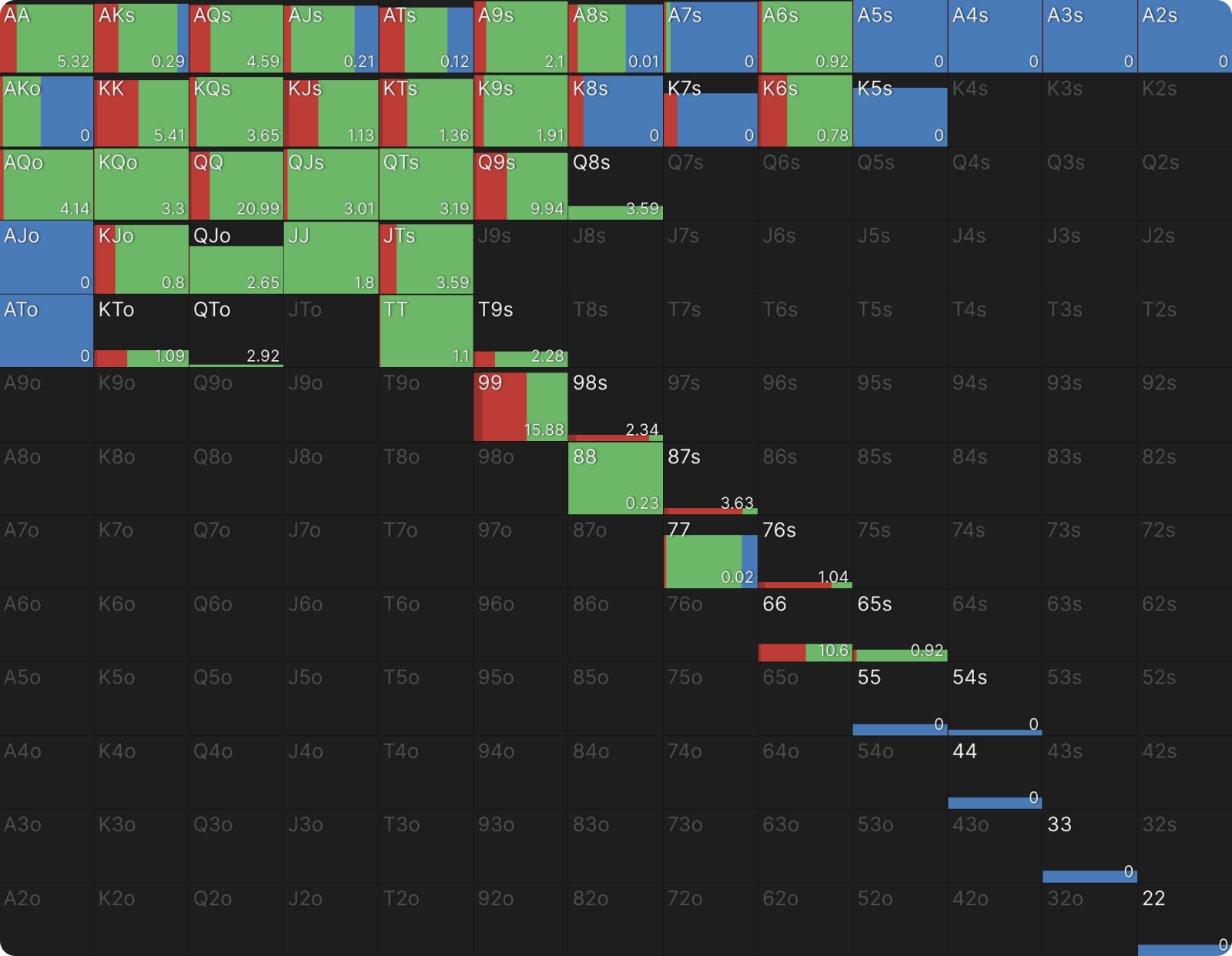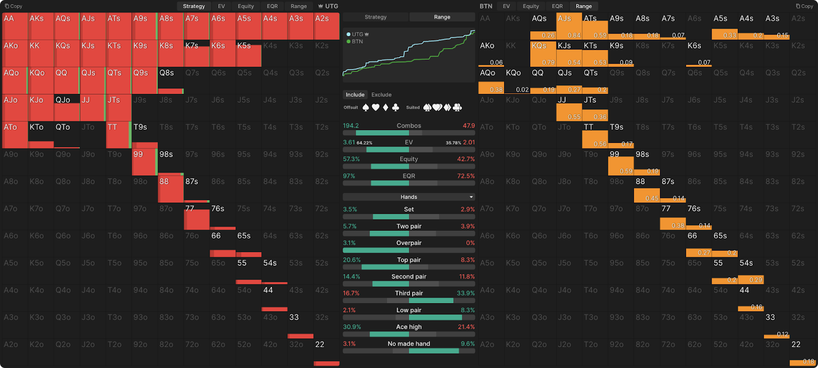UTG также будет делать чек-рейз с полярным диапазоном сильных рук и блефов с высоким эквити. Сильные руки UTG включают AA, KK, стриты и сеты. Наши блефы с высоким эквити включают полублефы, такие как 55 и 66, а также Туз-хай и Король-хай с возможностью бэкдор-флеша или стрита, такие как A7s, A6s и K6s. Это руки, которые имеют некоторый потенциал для улучшения до чего-то большого к риверу, как аварийный выход на случай, если нас заколлируют.