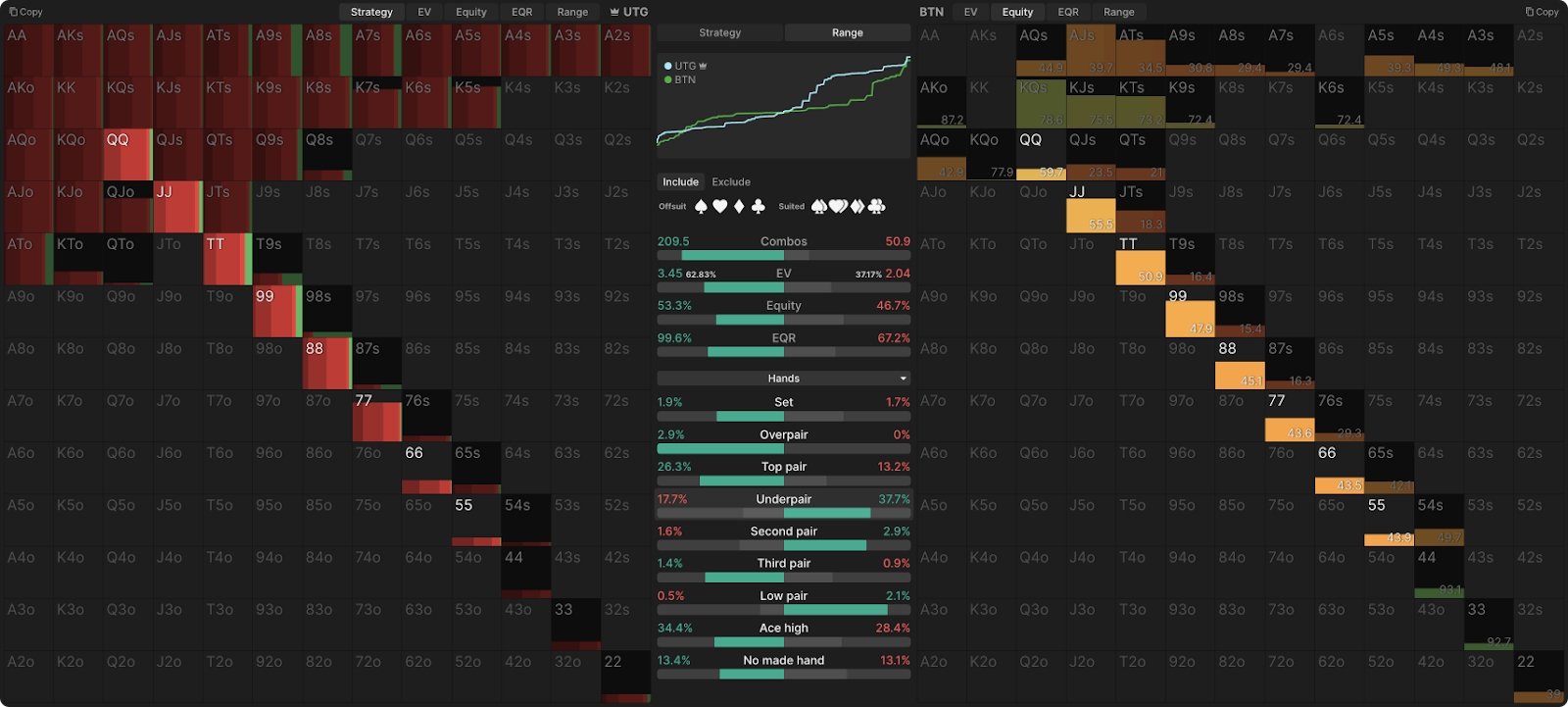 На первый взгляд, это выглядит, как подходящий флоп для UTG. Мы зацепились с KQ и AQ и наши бродвеи имеют некоторое дро-эквити. Таким образом, мы могли бы ожидать, что UTG будет делать конт-бет довольно часто, что, безусловно, было бы так, если бы мы были префлоп-рейзером (PFR) в позиции. Тем не менее, правильный ответ на самом деле для UTG — чекать весь свой диапазон. BTN имеет преимущество по эквити в 53% и имеет более высокий процент сетов. С явными недостатками в эквити и сильными руками UTG должен быть более консервативным и попытаться ограничить размер банка, находясь вне позиции.