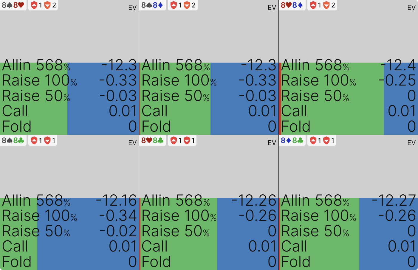 Отсюда мы можем видеть глобальные средние значения для каждого действия по всем флопам. На UTG мы должны делать чек 72% и, таким образом, конт-бетить здесь всего 28% раз! Большинство живых игроков, вероятно, делают конт-бет чаще в такой ситуации без позиции, чем в этом примере.