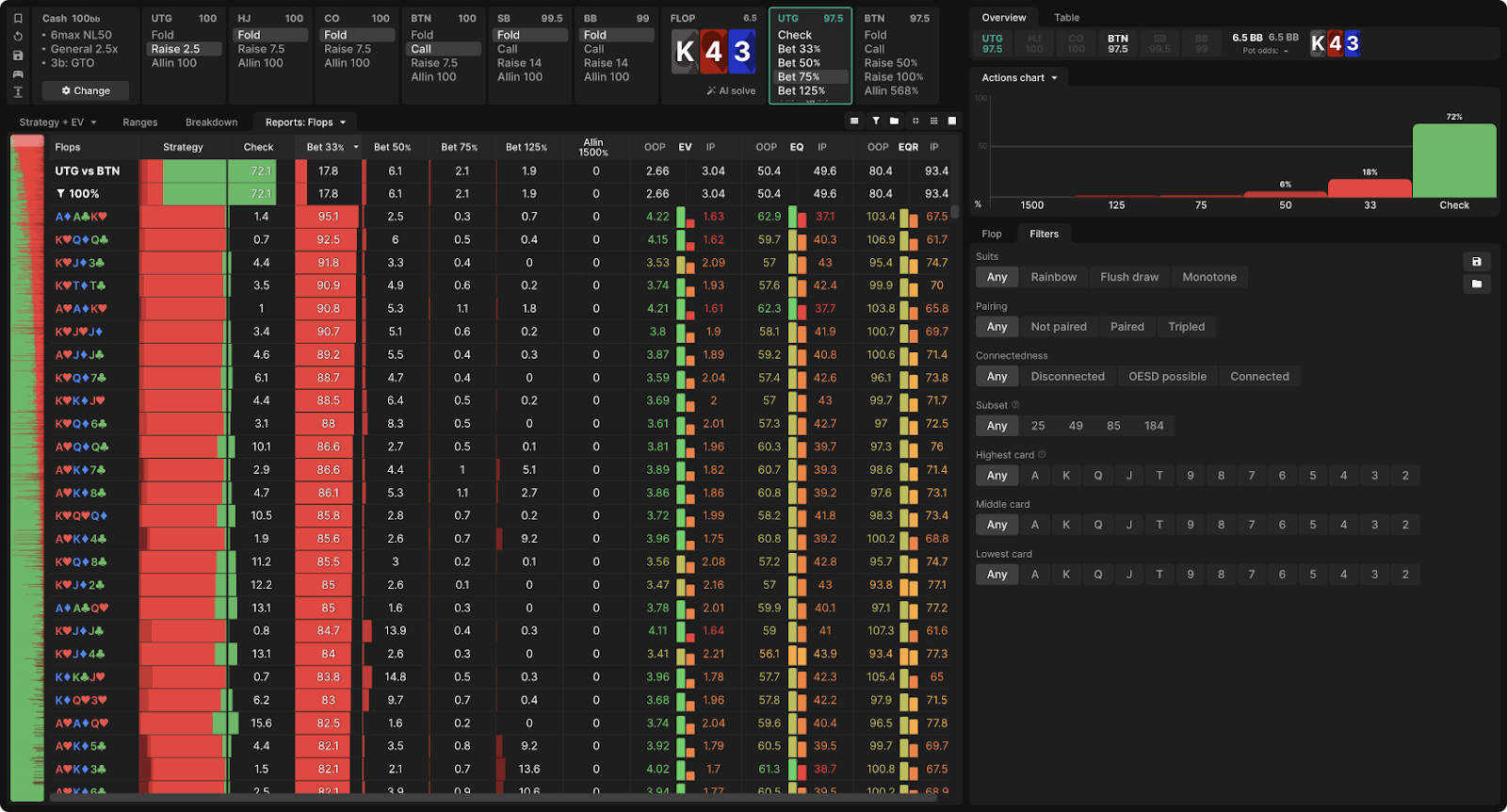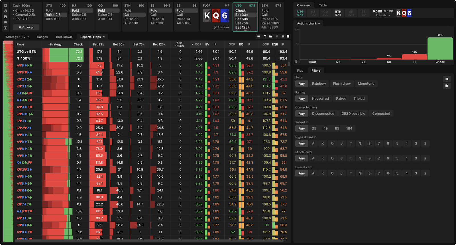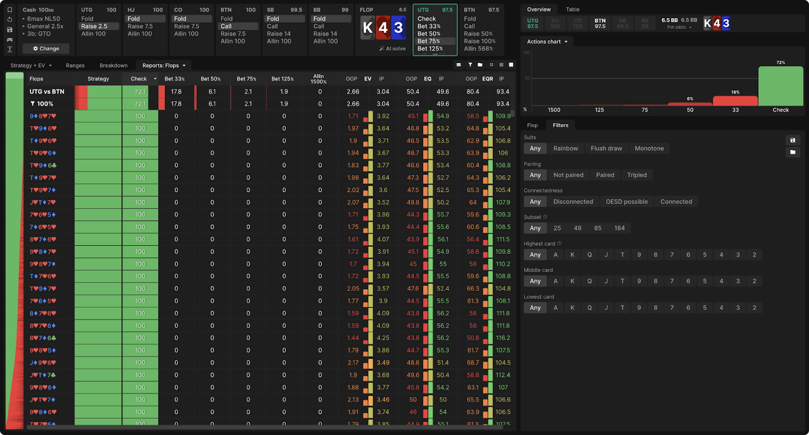 Здесь я отсортировал по графе «Ставка 33% банка» и мы сразу видим, что такие флопы, как AAK, KQQ, AKx и KTT, — это флопы, которые во многом попадают в диапазон открытия UTG. Таким образом, UTG всегда может начать с небольшой ставки. Отсюда я могу выбрать либо фильтр по высокой карте, либо изучить, например, парные доски или монотонные доски более подробно.