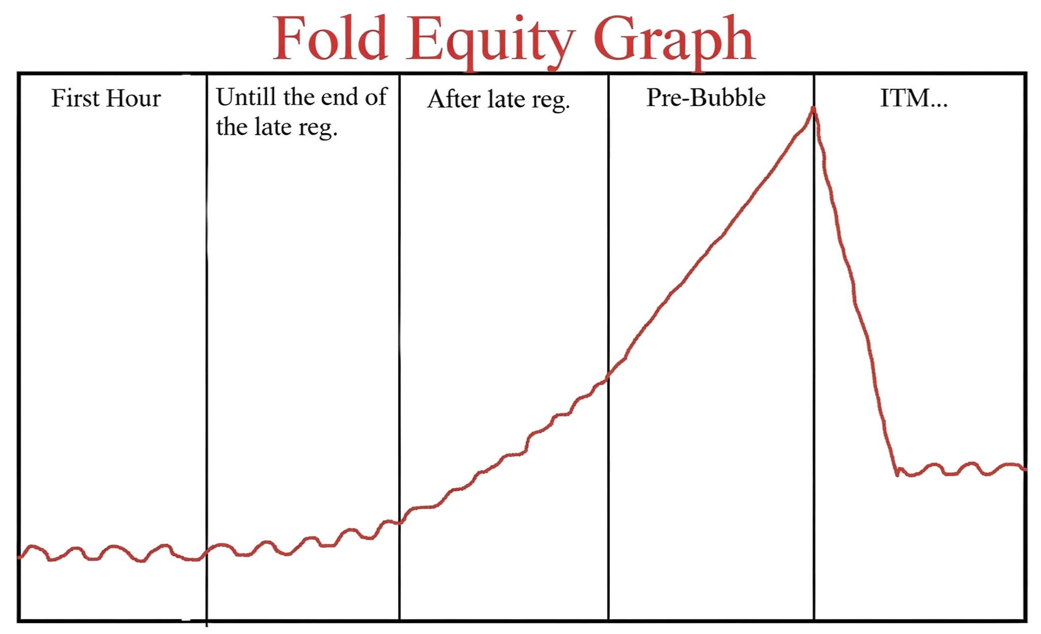 Это был график фолд-эквити, который работает по одной и той же схеме практически в любом турнире. Вот почему я предпочитаю искать потенциально выгодные ситуации в более поздних стадиях! Первая такая ситуация представляется нам на пребаббле и баббле турнира, и, как мы видим, сразу после начала ИТМ-зоны он стремительно падает. На данной стадии в игре, как правило, много коротких стеков, которые уже гарантировали себе минимальные призовые. Эти игроки начинают играть гораздо активнее, рестилить и опен-пушить, чтобы либо получить удвоение, либо покинуть турнир. Но чуть позднее, когда пэйджампы станут более существенными, а коротких стеков станет несколько меньше, мы снова окажемся в благоприятной зоне, где фолд-эквити вновь будет приносить агрессору потенциально высокое ожидание.