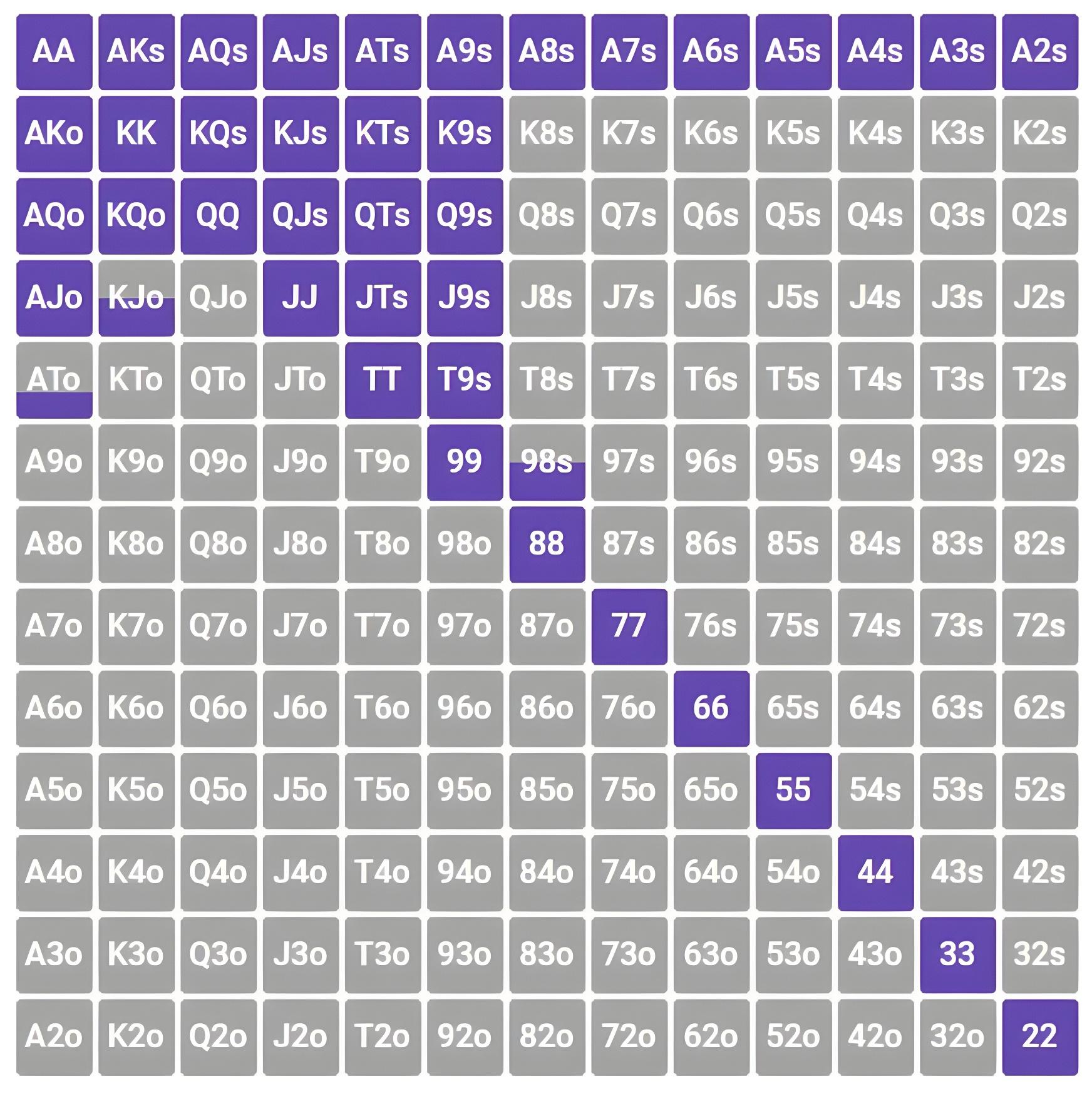 - Мы практически исключили низкие карманные пары (22-55) оставив очень маленький вес для ситуаций, когда вы будете играть за очень тайтовым столом, либо будете чип-лидером данного стола.