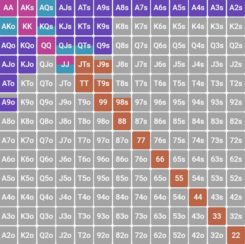 Эффективный приём против стила — рестил. Так называют 3-бет против стила с одной из поздних позиций: кат-офф, баттон или малый блайнд. Вы же понимаете, что стилить блайнды выгодно, а значит и другие игроки будут делать это на большом количестве слабых рук. Значит нужно “защищать блайнды”, делая 3-бет на подходящих для этого руках (как на велью, так и в блеф). Диапазоны 3-бета со всех позиций вы также можете получить, присоединившись к программе лояльности нашего сайта всего за 1 рум, зарегистрированный через наш сайт. Но есть и полностью бесплатная версия, которая придет вам на почту сразу после регистрации на сайте.