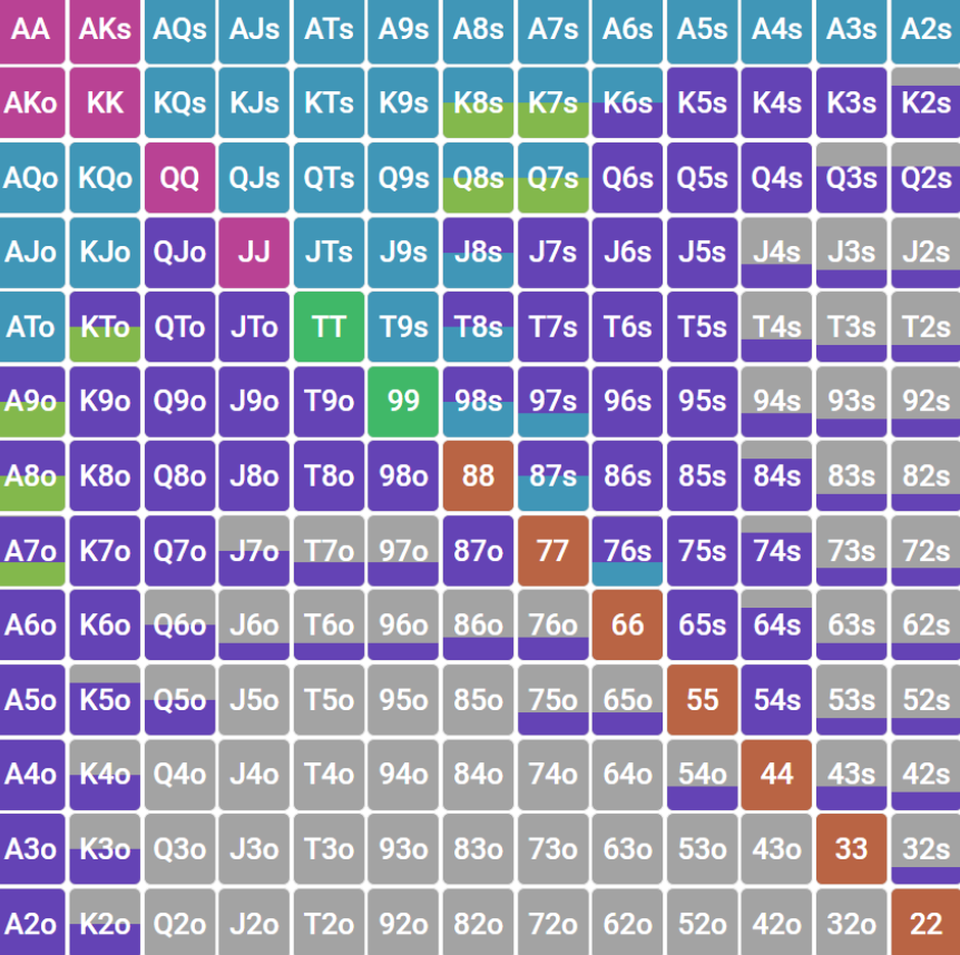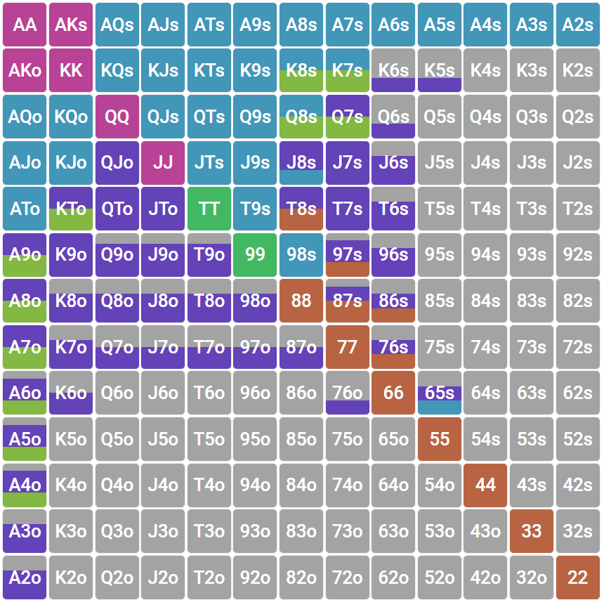 Помимо этого, диапазон опен-рейза с баттона очень большой, поскольку осталось всего 2 позиции за вами, и обе поставили блайнды вслепую, поэтому их очень выгодно атаковать на широком диапазоне. Более того, большинство игроков настолько плохо защищается на блайндах, что мы часто вправе открывать под 100% диапазона стартовых рук, выдавливая оппонентов из банка на последующих улицах при помощи ставок. И это будет математически обоснованно.