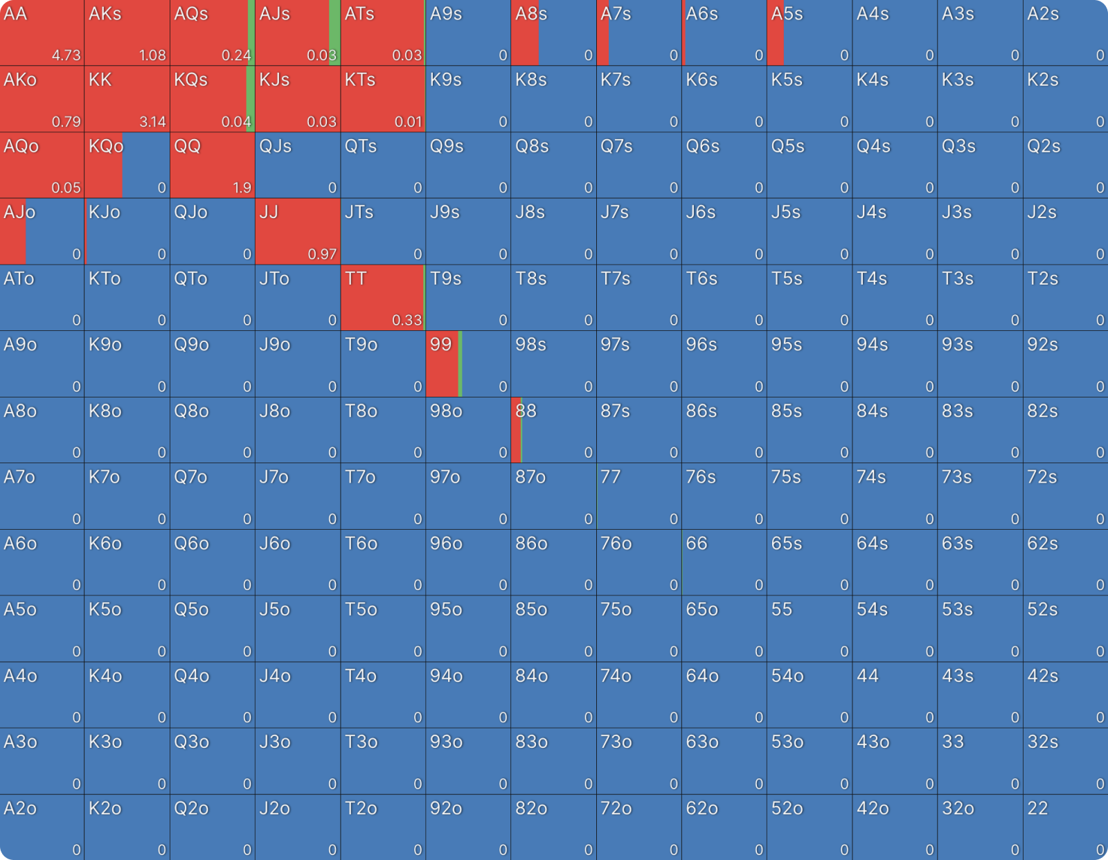Диапазон колла UTG скромен и капнут. Он состоит почти исключительно из рук, которые недостаточно сильны для пуша, и которые коллируют только из-за привлекательных шансов банка (9,5:3):