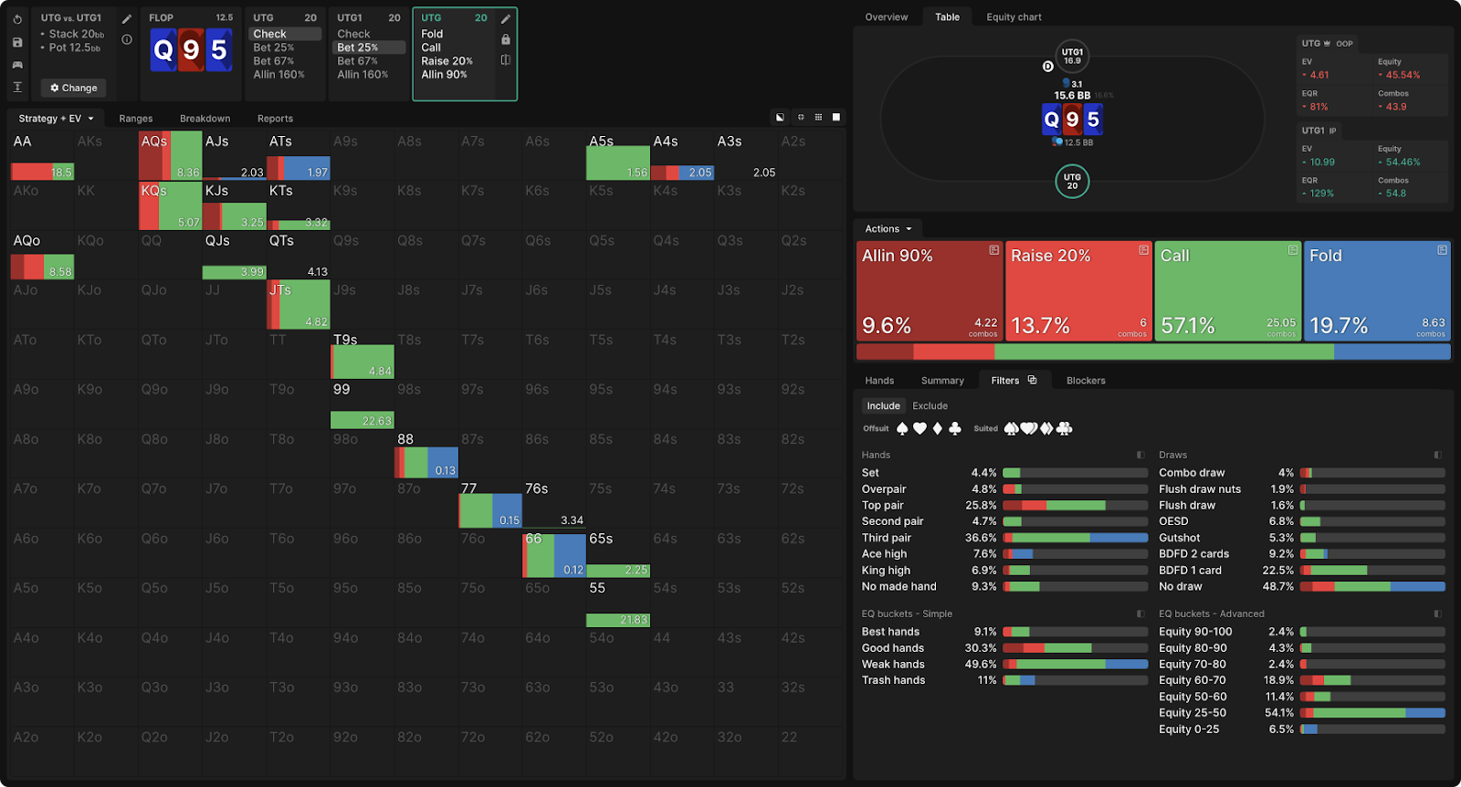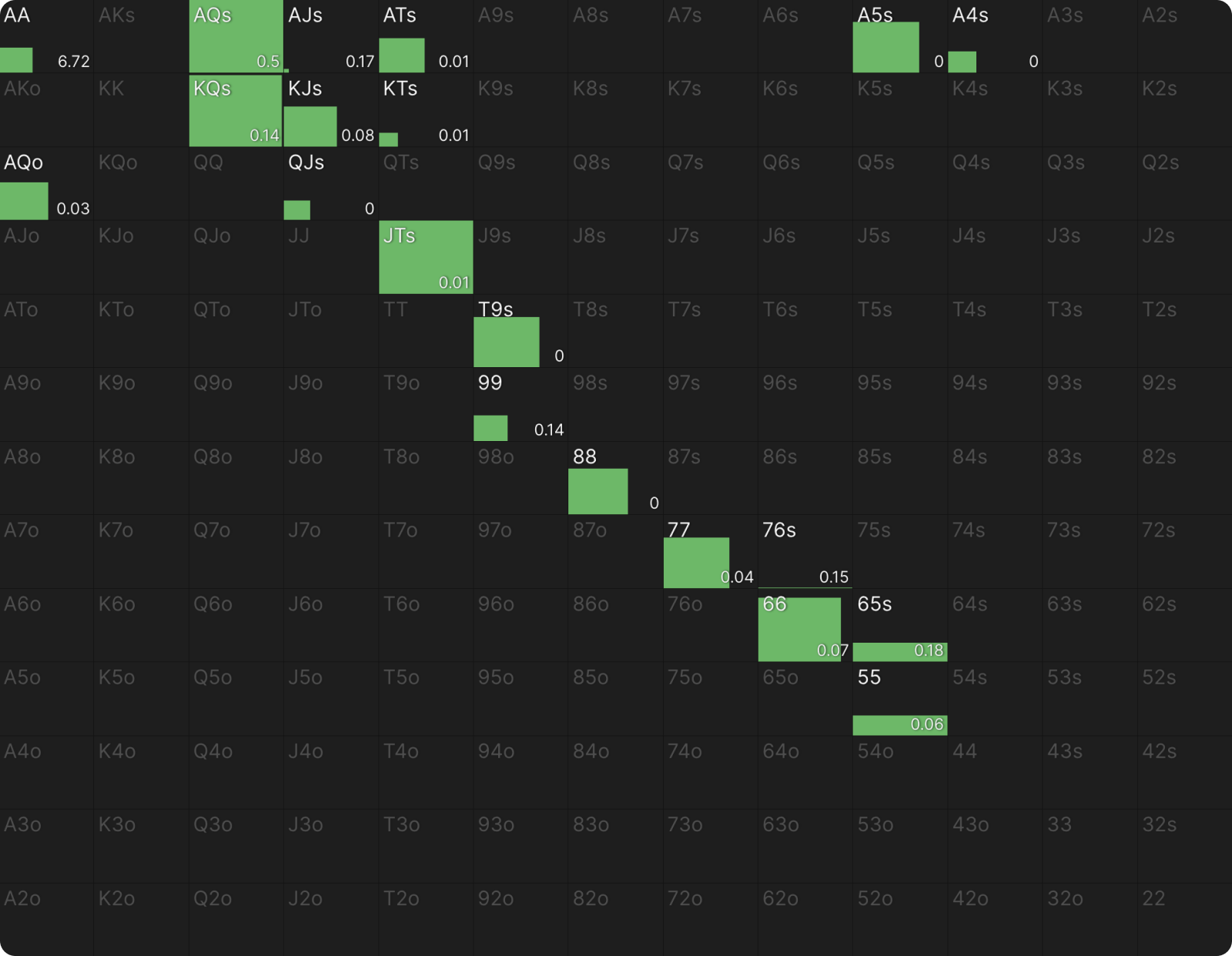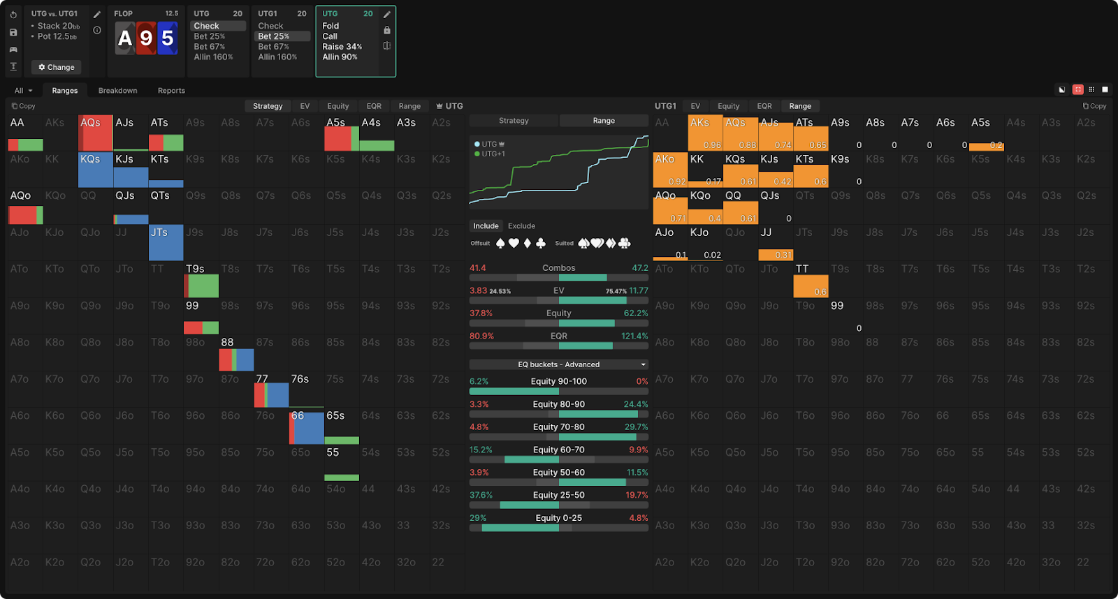 Если заменить Q на туза третьей масти, то это будет очень здорово для UTG+1. На первых двух флопах, которые мы рассмотрели, у него было примерно 53% эквити, но на у него 61%. Несмотря на это, UTG имеет преимущество (6% > 0%) с точки зрения самых лучших рук (топ 10% диапазона по эквити). Для визуального подтверждения взгляните на две пары и более сильные комбинации в обоих диапазонах, такие как AA, 99, 55 и A5s.
