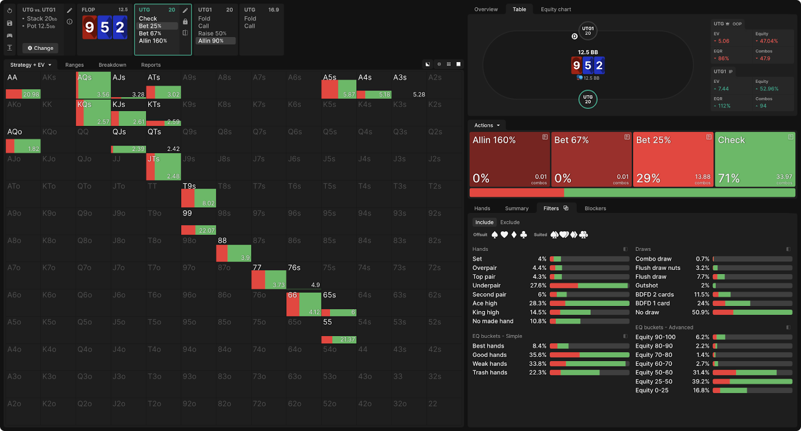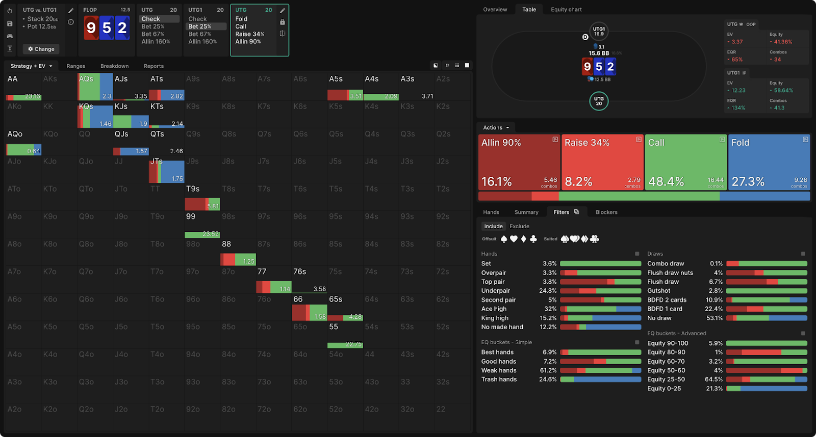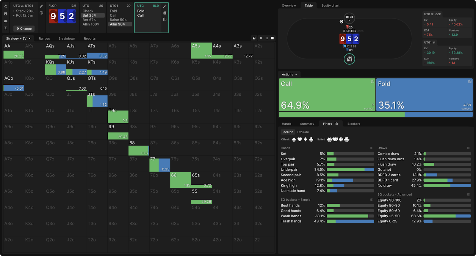При этом он пасует чаще, чем по минимальной частоте защиты (MDF). Здесь есть некоторый блокирующий эффект — когда у UTG+1 нет туза, гораздо более вероятно, что у UTG есть, поэтому блефы не так прибыльны, как кажется, но это в основном связано с силой диапазона UTG+1. На этой доске у него просто не так много рук, с которыми можно было бы блефовать, и у UTG не так много рук, с которыми можно было бы защищаться. Почти 60% диапазона UTG попадают в папку с эквити 0-25%, что делает его настолько слабым, что ему приходится либо блефовать, либо фолдить. К