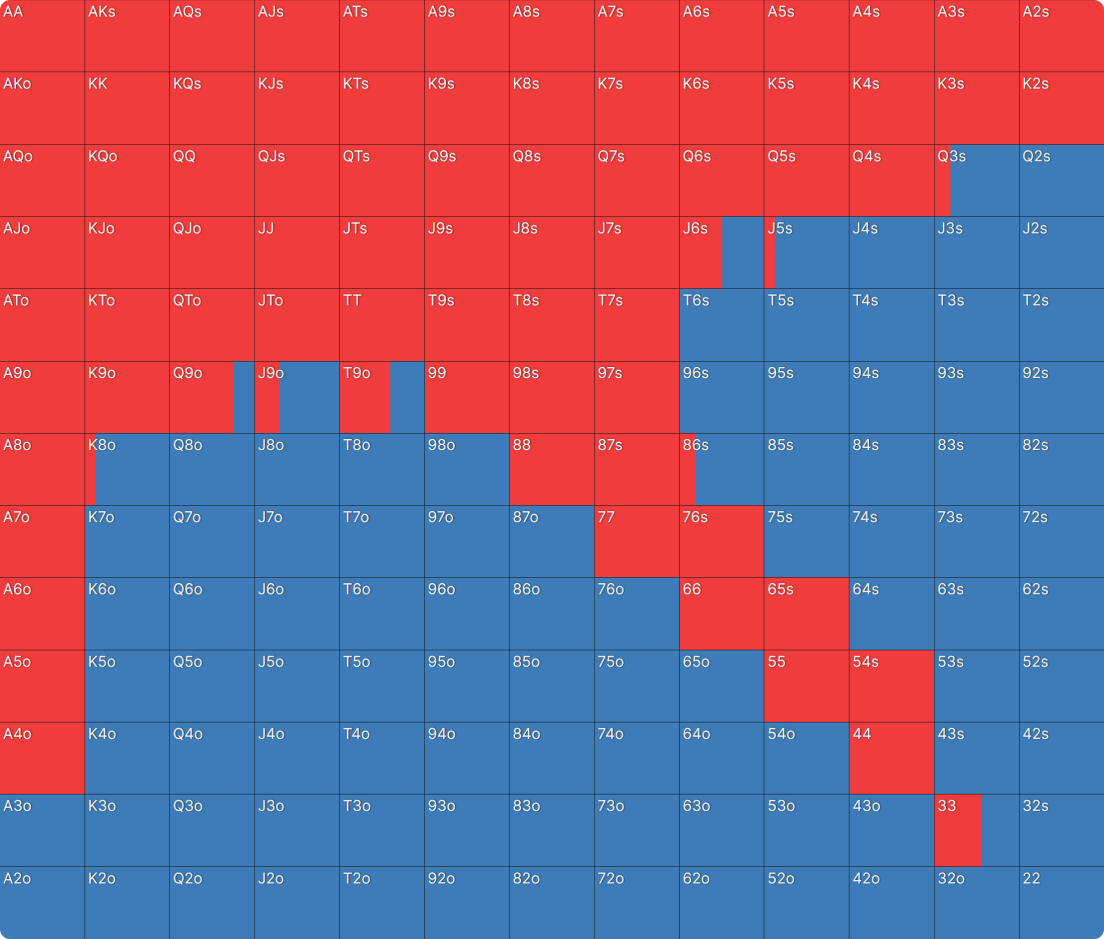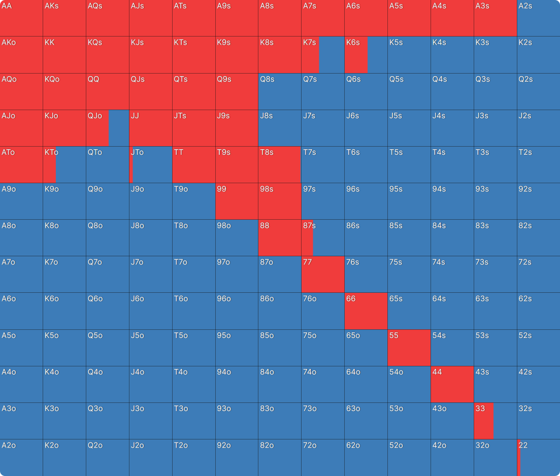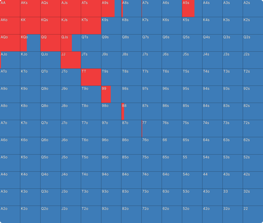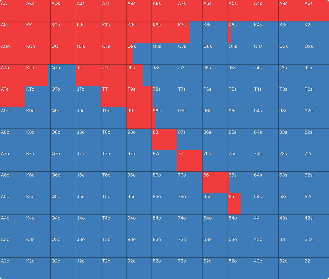 В первой ситуации у каждого игрока по 40bb. Это диапазон открытия UTG: