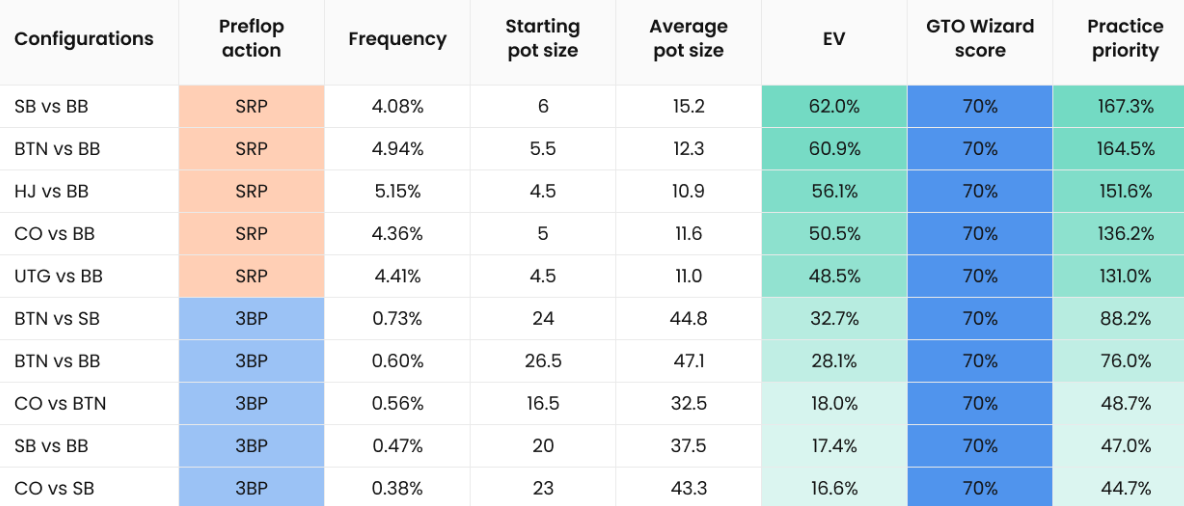Принцип Парето дал мне повод поделиться, пожалуй, моим любимым видео от Tombos21. В этом видео он делится своей Таблицей «Важности спотов», невероятно полезным инструментом. Он показывает самые важные постфлоп-сценарии, которые нужно изучить по порядку. Это основано как на частоте их появления, так и на среднем размере банка.