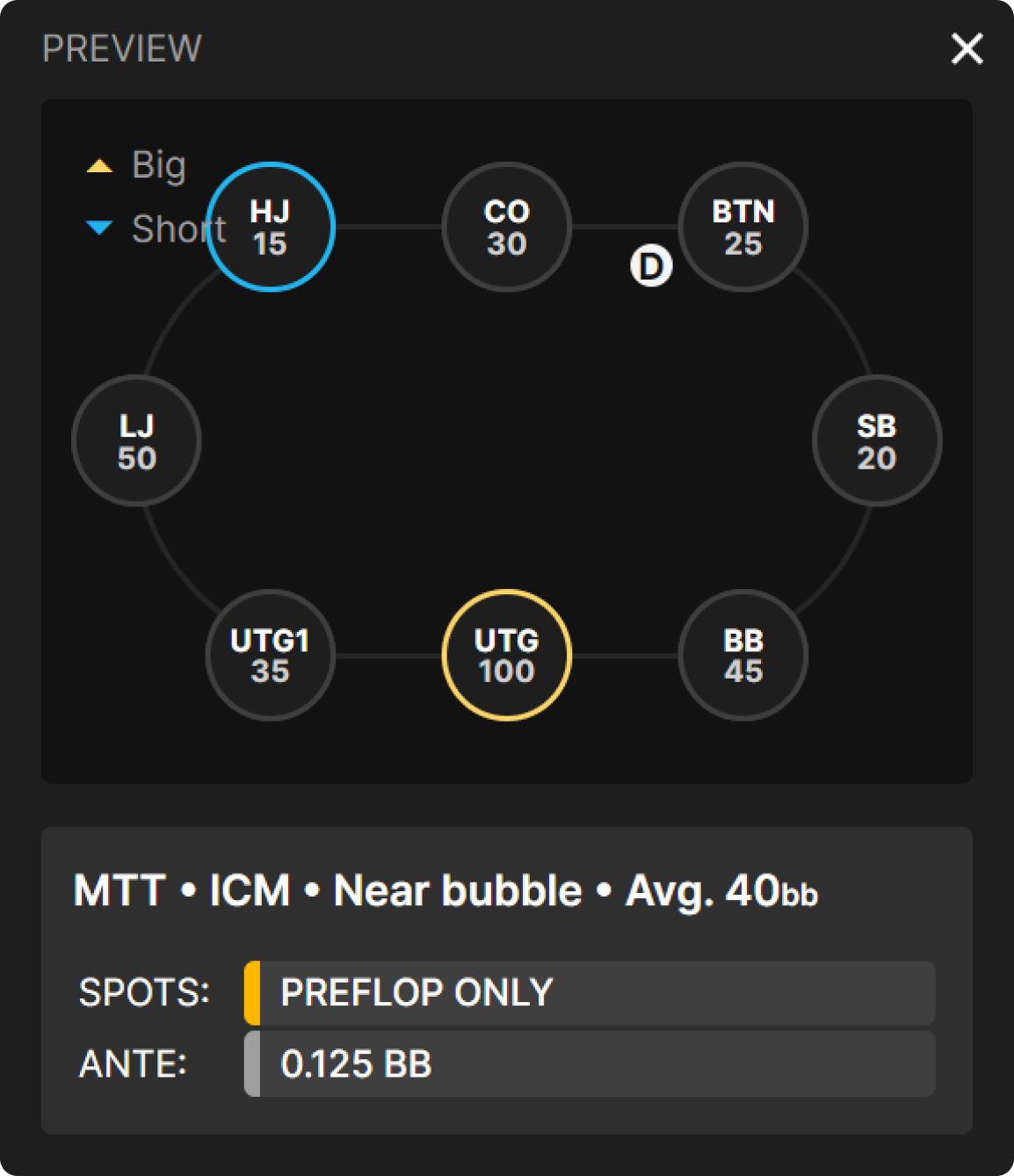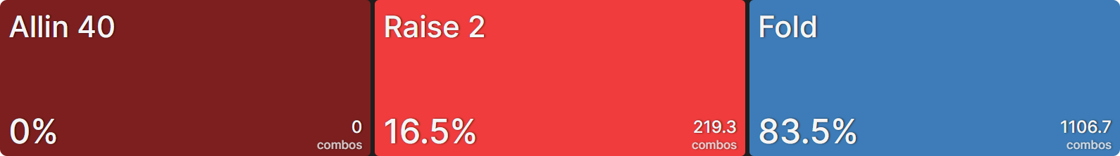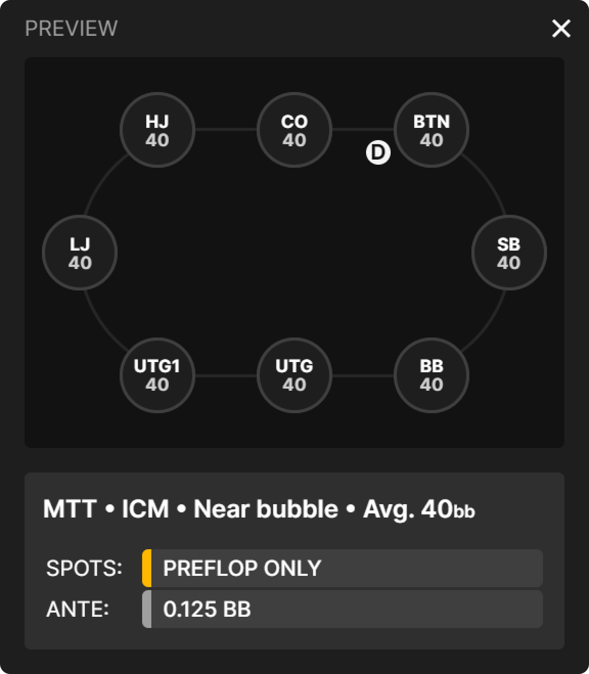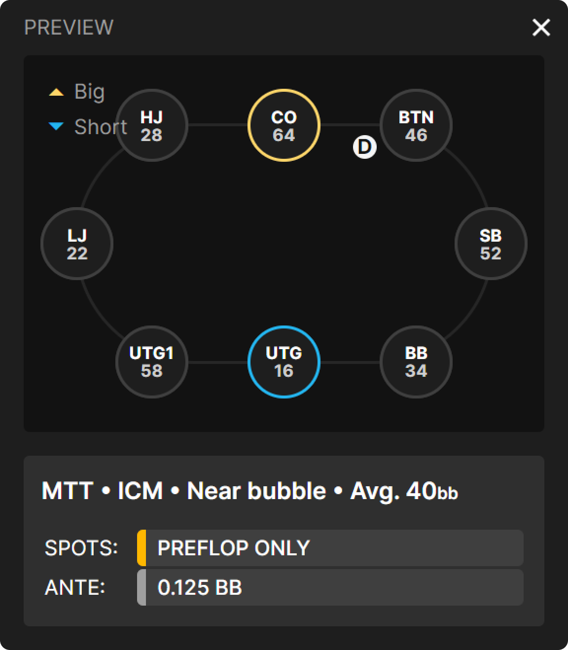 И, наконец, еще одна ситуация на баббле со средним стеком 40bb, но теперь UTG — короткий стек с 16bb: