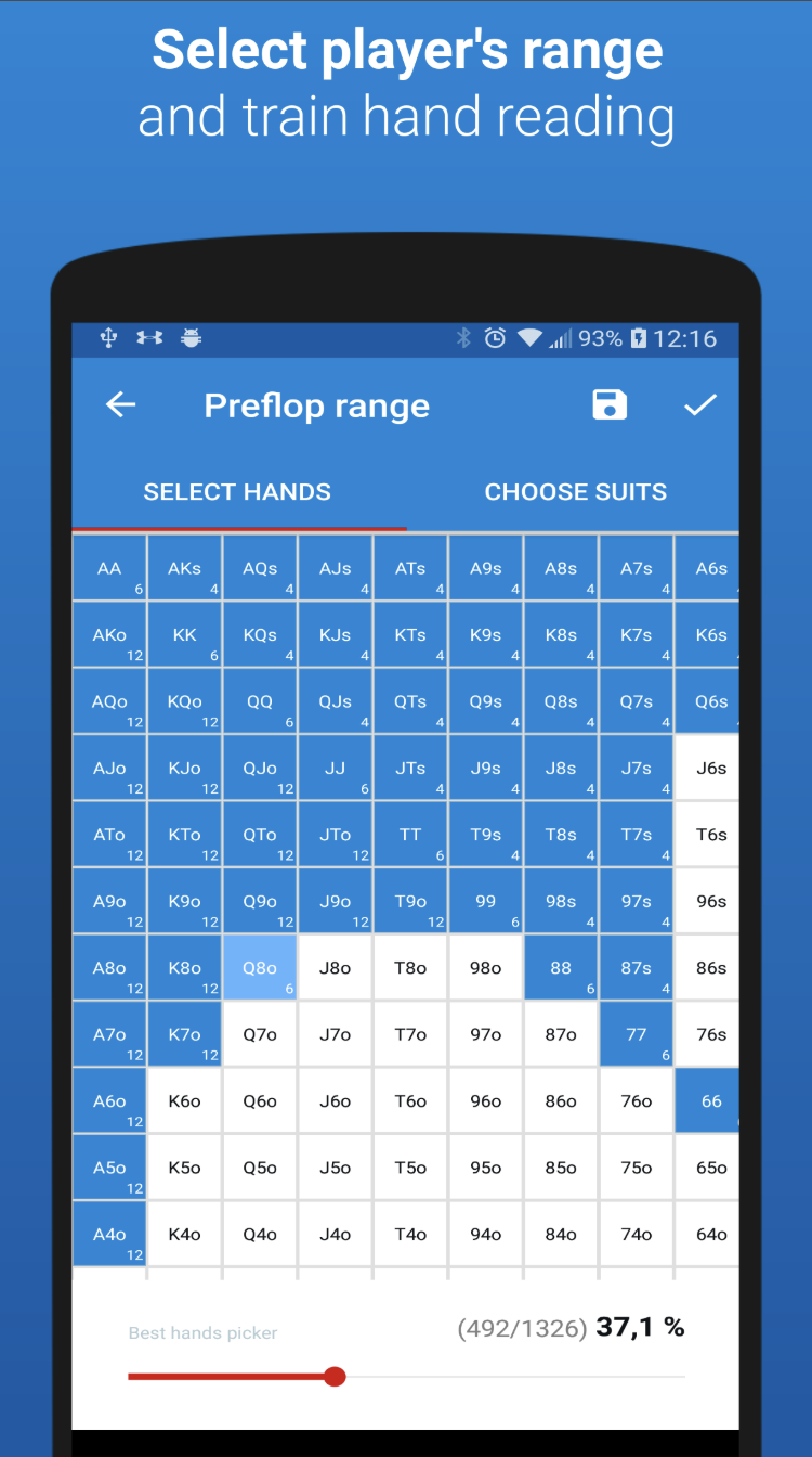 Все эти функции доступны в бесплатной версии. Ложка дёгтя: язык интерфейса программы — английский. Хотя большинство действий здесь совершаются интуитивно. В платной версии, которая стоит от 119 рублей в месяц, становится доступным расчёт фолд эквити, эквити колла, а также ряд дополнительных параметров. Это лучшая программа для смартфона и планшета, используя которую вы научитесь читать диапазоны соперника, понимать шансы их усиления на конкретной доске. В общем, вы существенно подтяните свою игру на постфлопе.