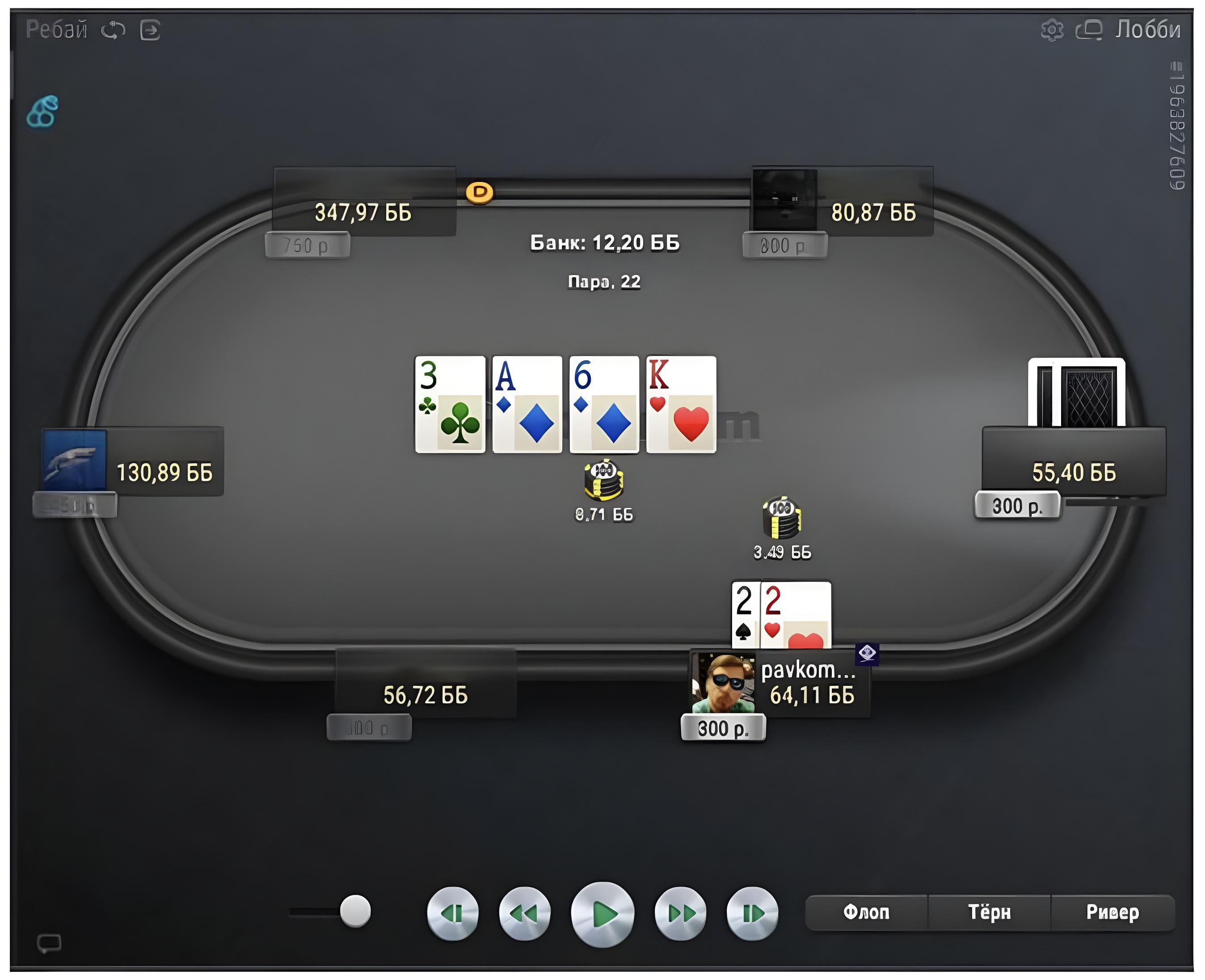 Какие-то натсы мы не особо закладываем в диапазон колла оппонента, так как с натсами он захочет играть более крупный банк и большую часть таких рук уведет в чек/рейз терна. Но даже если заложить с небольшим весом руки типа сетов (33, 66) и доперов (А3 и А6, возможны мастевые К3, К6), очень часто мы увидим с ними донк ривера от оппонента, так как иначе ему очень редко представится возможность добрать что-то на ривере. Таким образом, после вышедшей тройки по риверу и чека оппонента наш мув заряжен и готов к выстрелу!