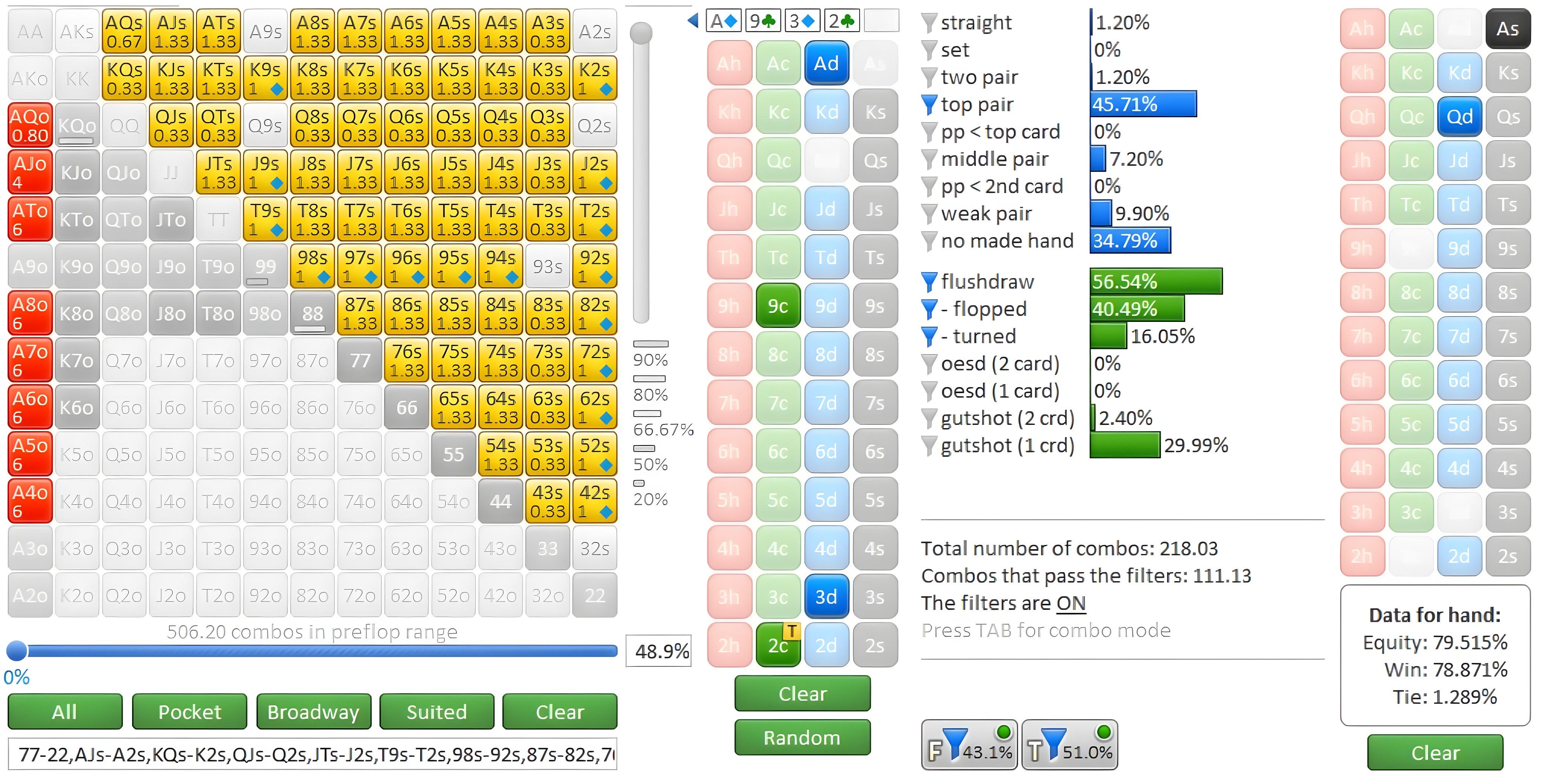 Сетов очень мало, так как мы очевидно получим 3-бет на префлопе от АА и часто от 99. Как видим, даже на доске с тузом диапазон колла довольно широкий.