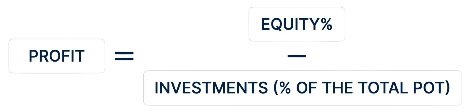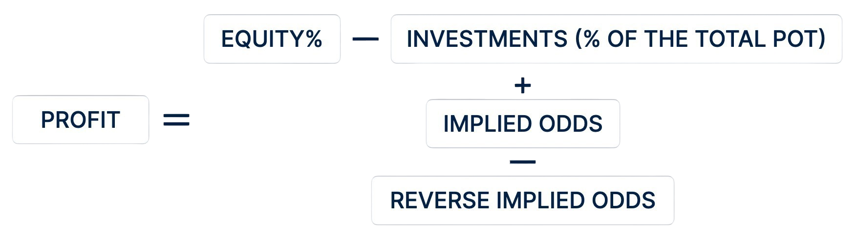 Когда у вас остаются еще фишки, на которые вы можете сыграть с оппонентом на следующих улицах торговли, используется более точная формула для определения заработка, исходя из эквити вашей руки.
