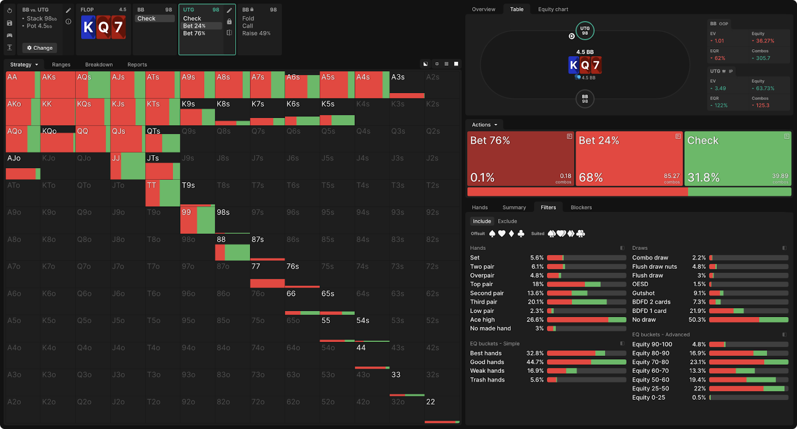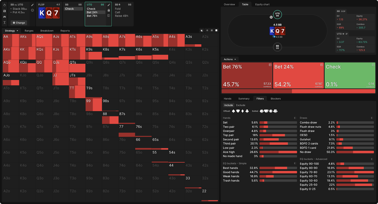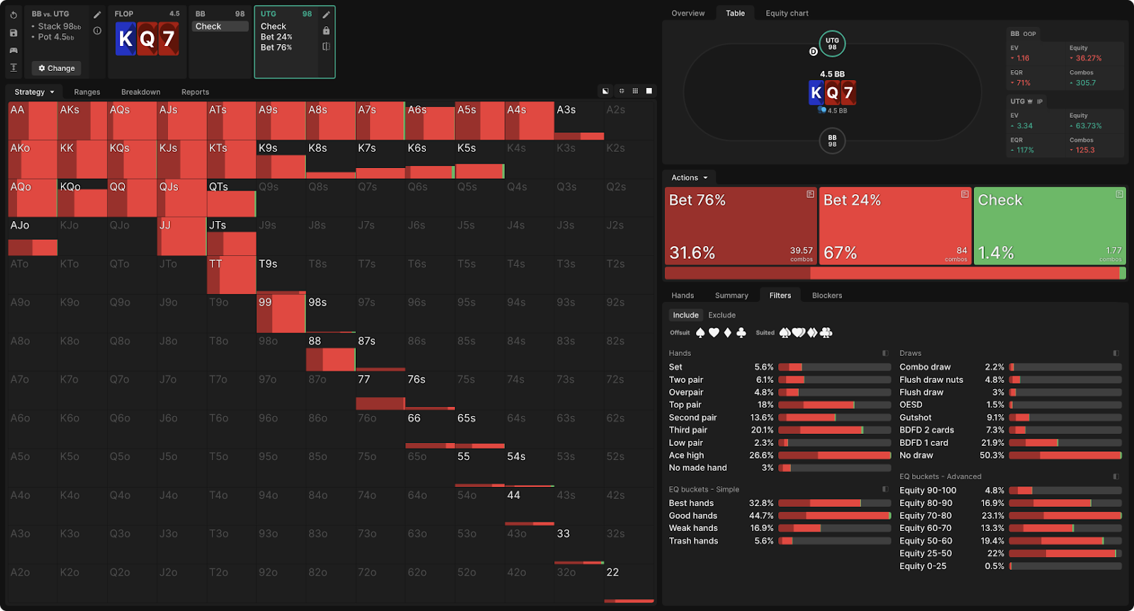 После чека BB UTG может сделать чек или ставку в размере 76% или 24% банка.