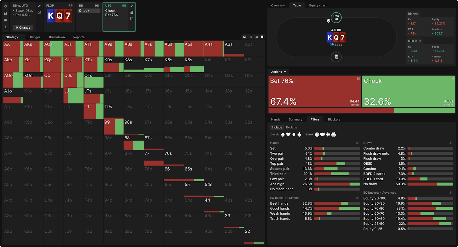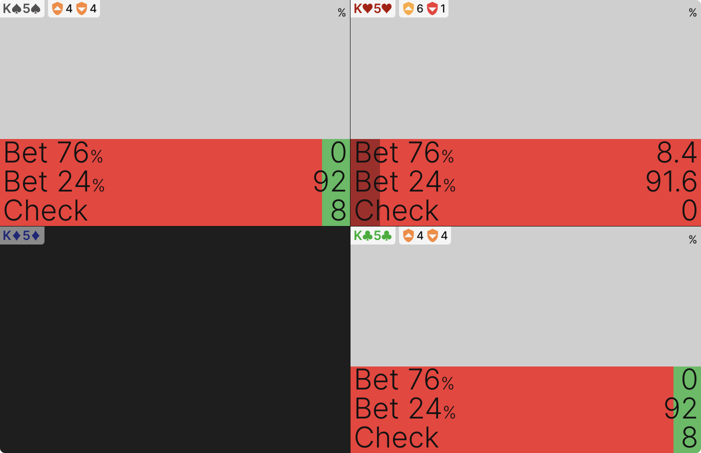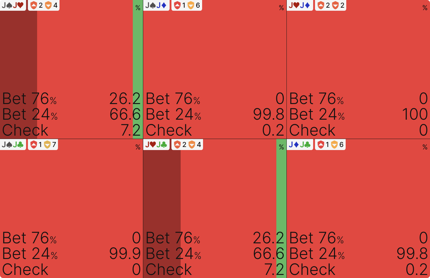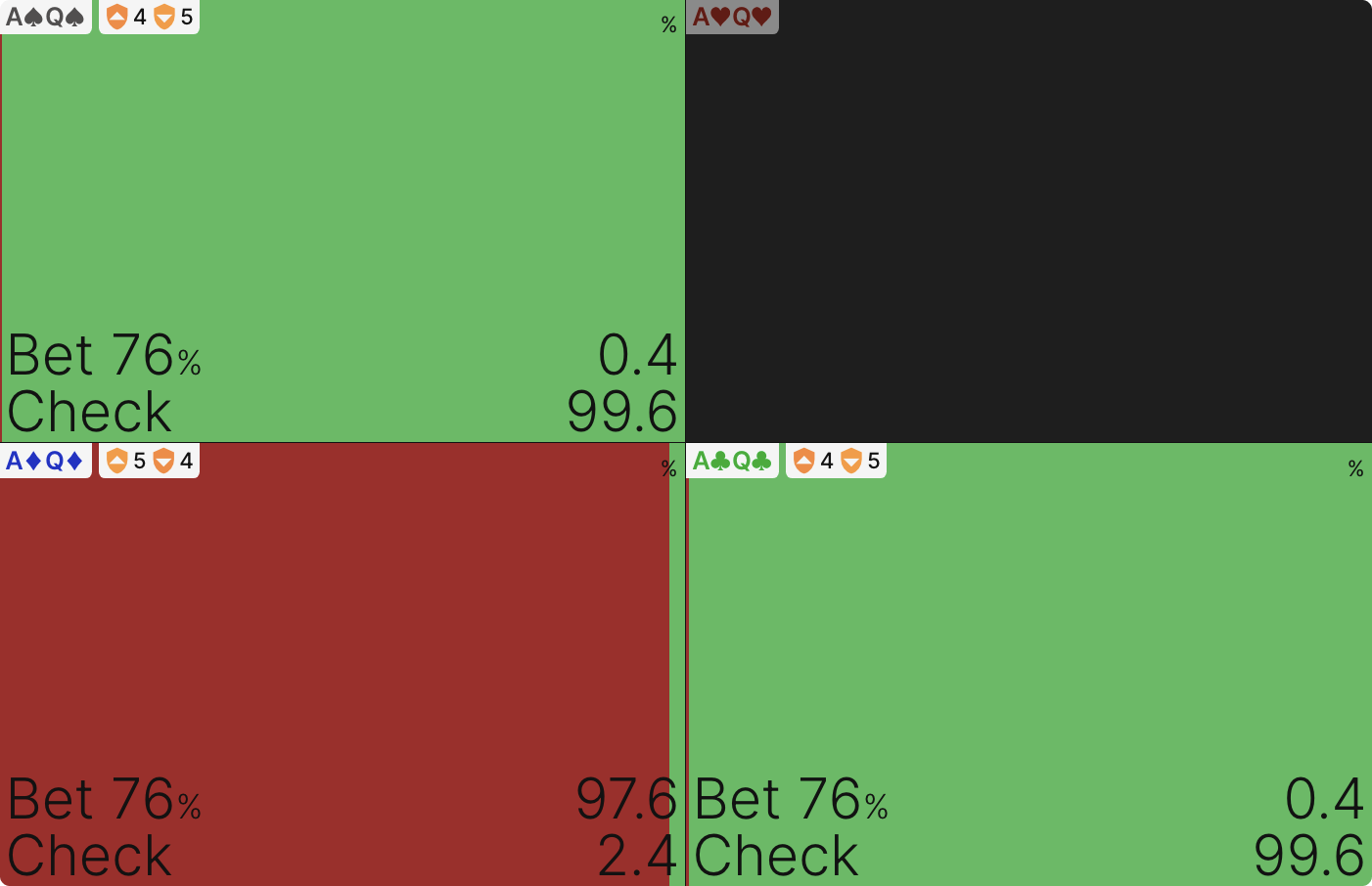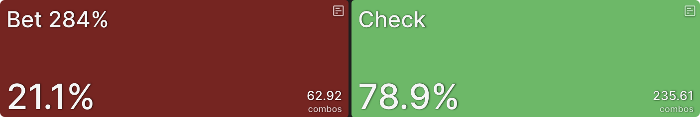 Как вы можете видеть, солвер никогда не чекает (этот 1% является погрешностью — если бы симуляция была запущена до 0 эксплуатируемости, она бы исчезла), но он в значительной степени использует оба размера ставок и большинство рук смешиваются между ними: