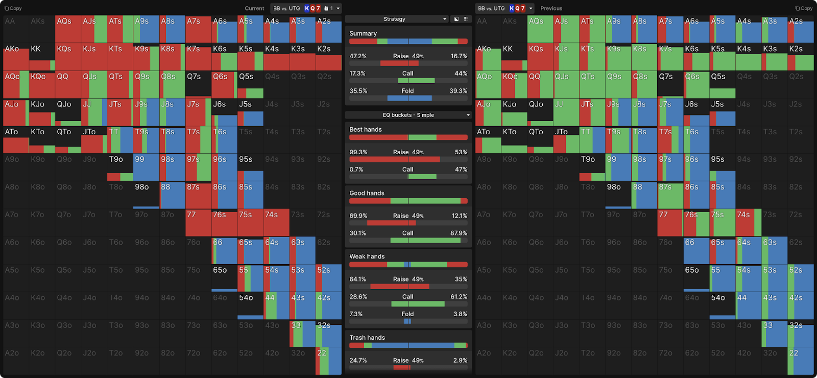 Основная цель небольшой продолженной ставки, по-видимому, заключается в том, чтобы оставить множество рук средней силы в диапазоне UTG. Однако это не полное объяснение, поскольку оно не учитывает наличие сильных рук, таких как AA и K7s в диапазоне малых ставок. Почему эти руки не предпочитают строго большую ставку, учитывая, что они много выигрывают от роста банка против верхней части диапазона BB? Распространенное объяснение заключается в том, что эти «монстр руки» «защищают» средние руки, не давая BB рейзить, но это немного вводит в заблуждение. Это подразумевает, что самые сильные руки приносятся в жертву, отказываясь от более высокого варианта EV ради других рук в диапазоне UTG. Такого рода жертва никогда не является особенностью решений GTO. Солверы не отказываются от EV одной руки, чтобы увеличить EV другой.