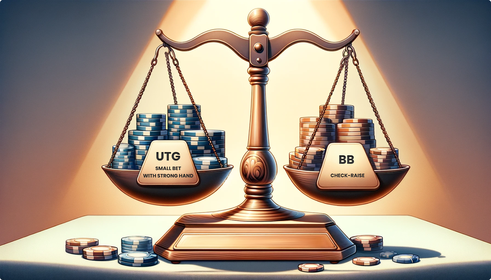 Вы можете интуитивно понять, как работает равновесие, думая с точки зрения балансировки весов. Для UTG EV небольших ставок с сильными руками зависит от частоты чек-рейза BB. А для BB EV чек-рейза зависит от частоты небольших ставок UTG с его сильными руками.