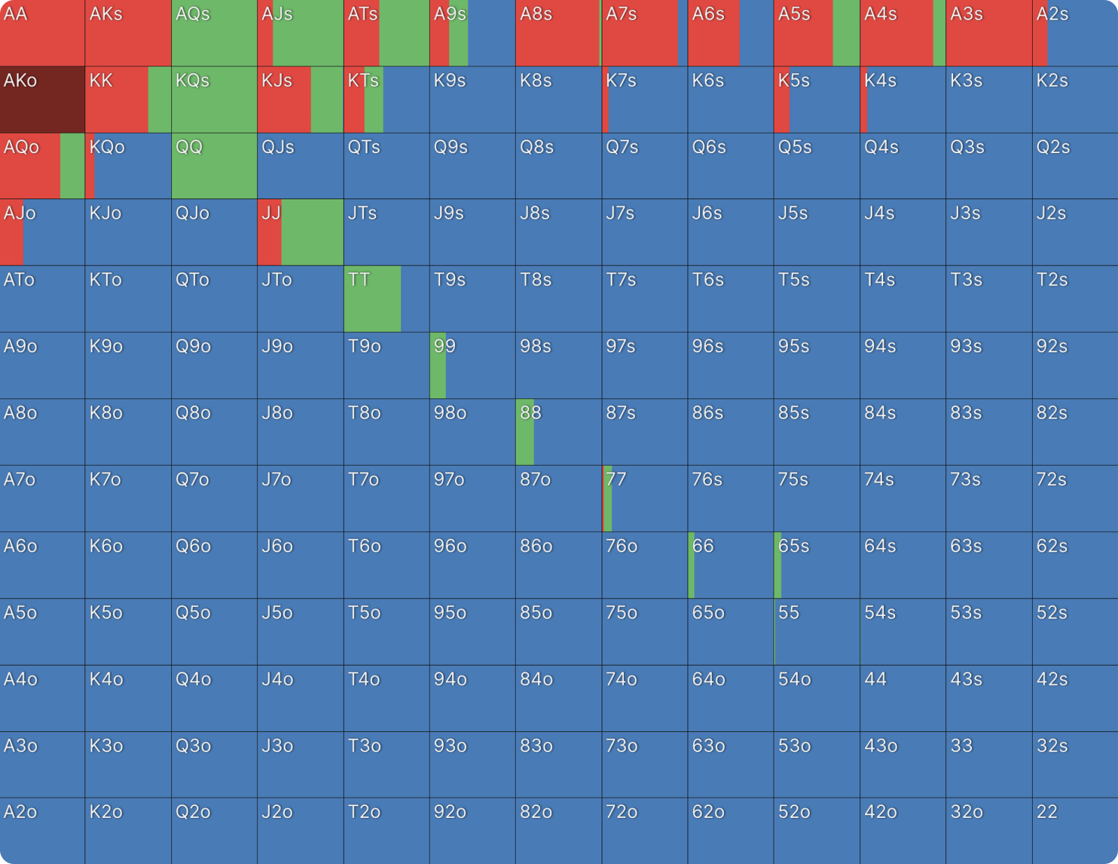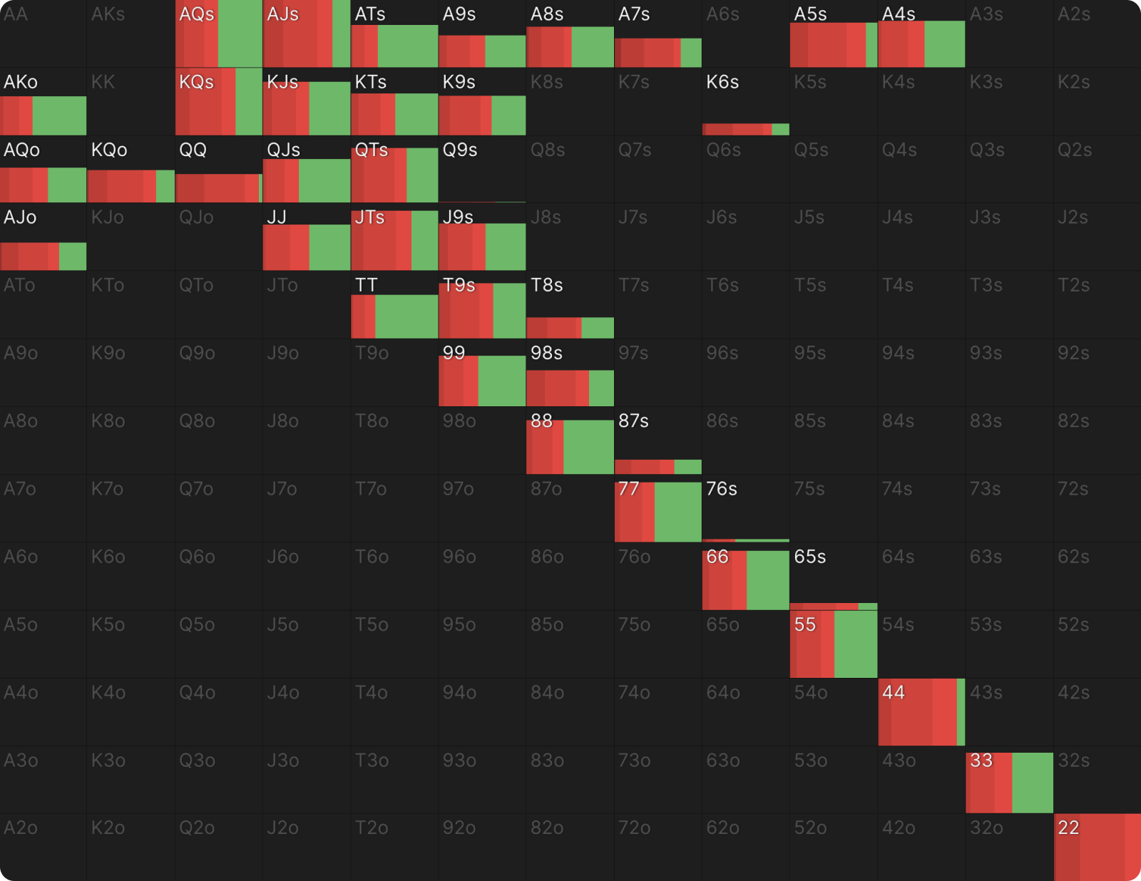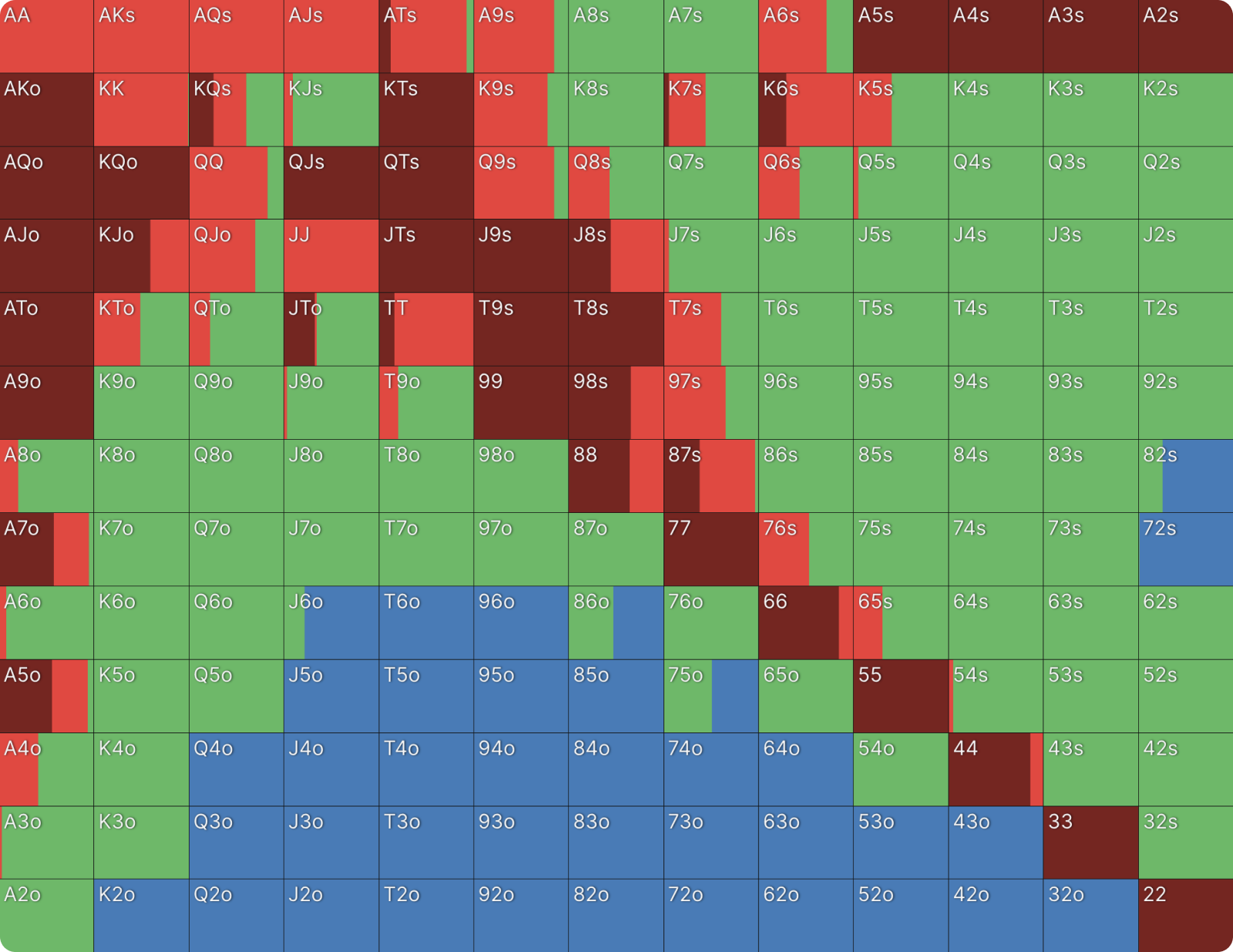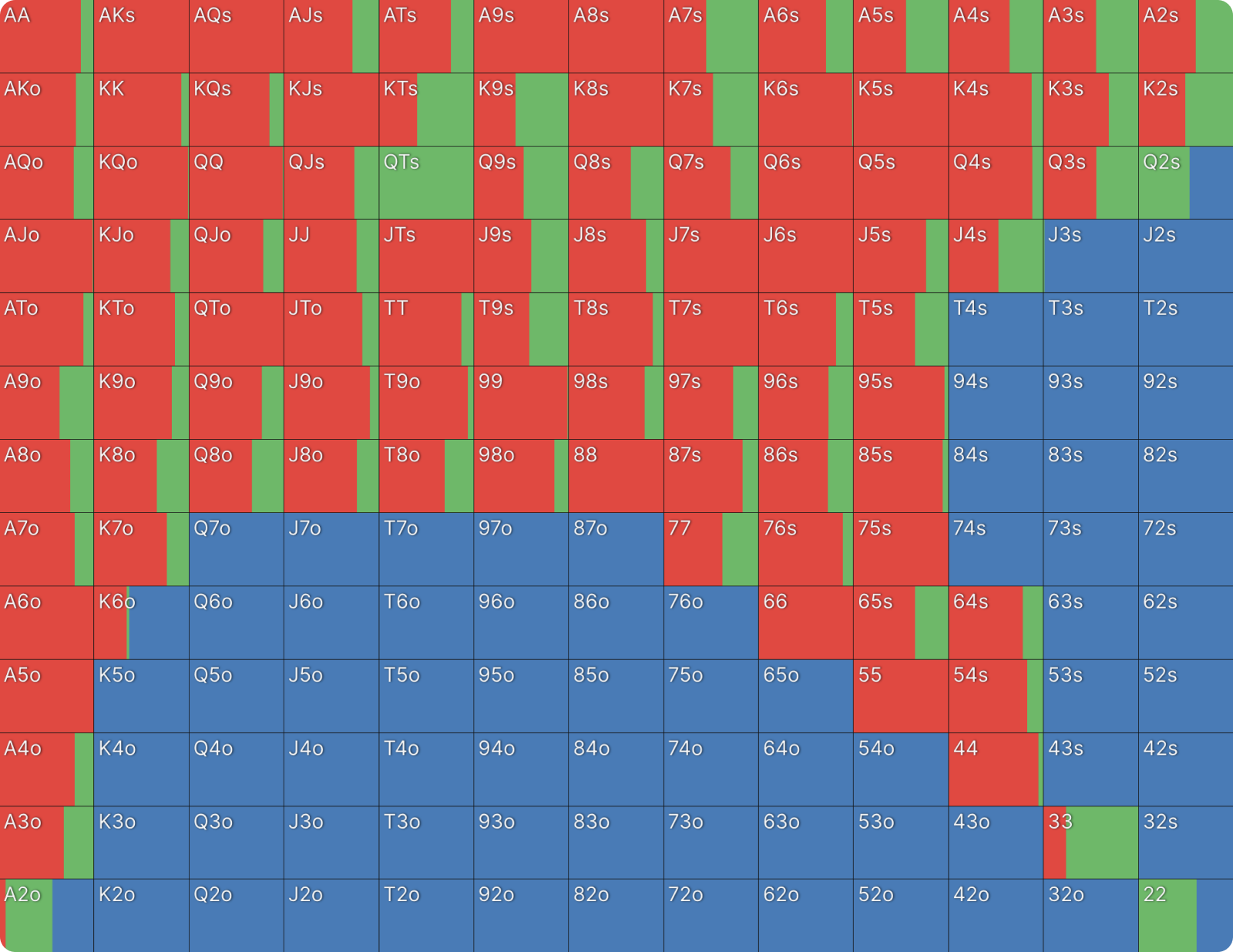 22 также ставит с высокой частотой по схожим причинам. Сет двоек — одна из самых сильных возможных комбинаций, и он хочет, чтобы банк увеличивался. Более того, 22 не блокирует потенциальные коллы. 22, как и QQ, целится в руки с валетом (J-x), которые он не блокирует. То же самое относится и к оверпарам. Вы можете увидеть дополнительные доказательства того, почему QQ и 22 ставят чаще других рук, посмотрев на другие комбинации в этом диапазоне.
