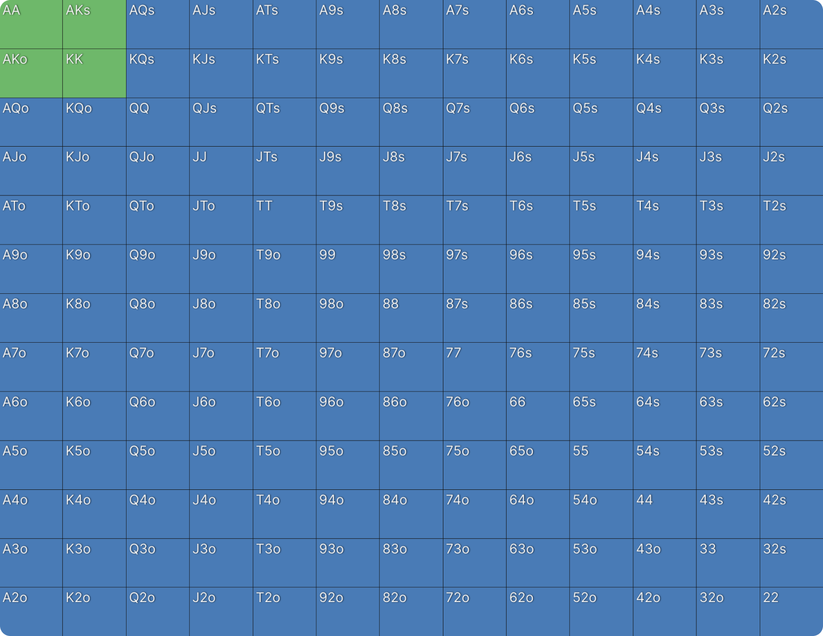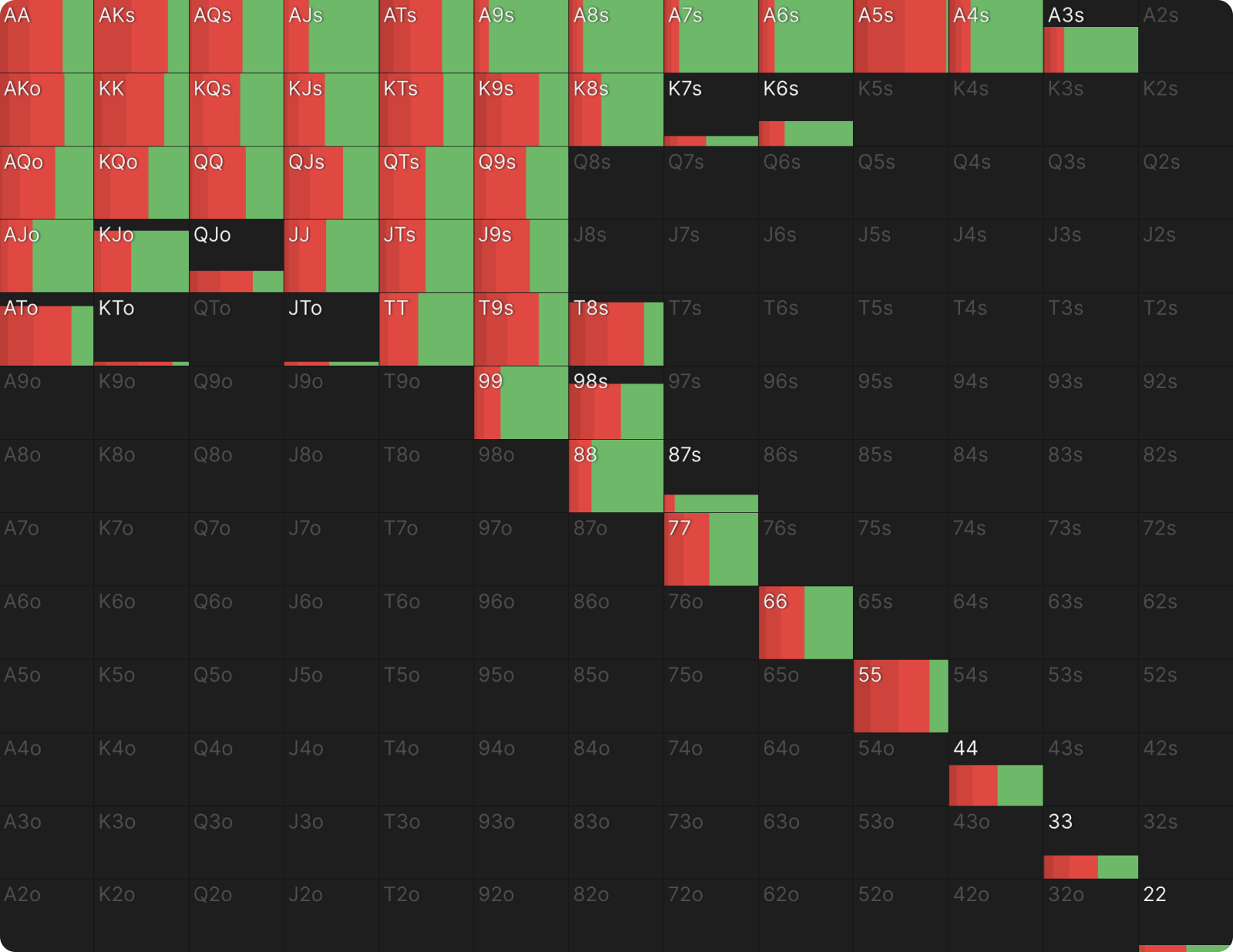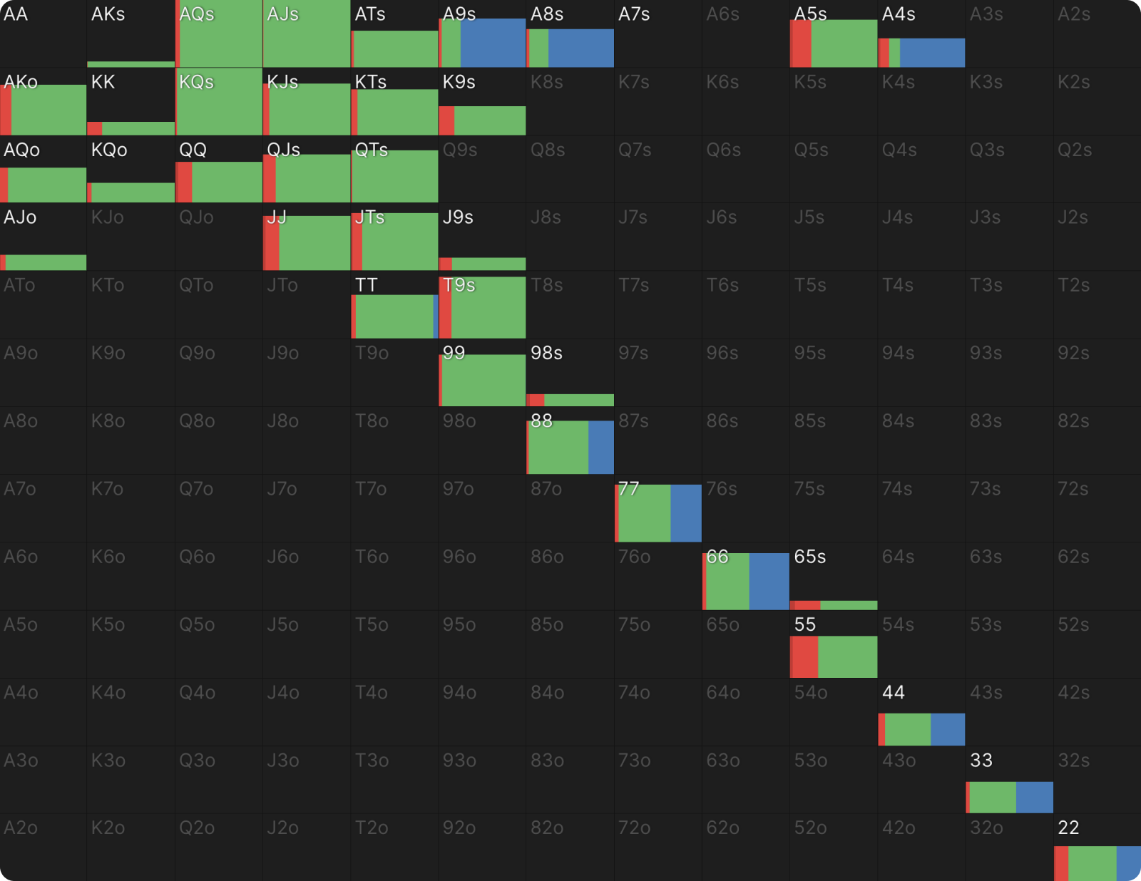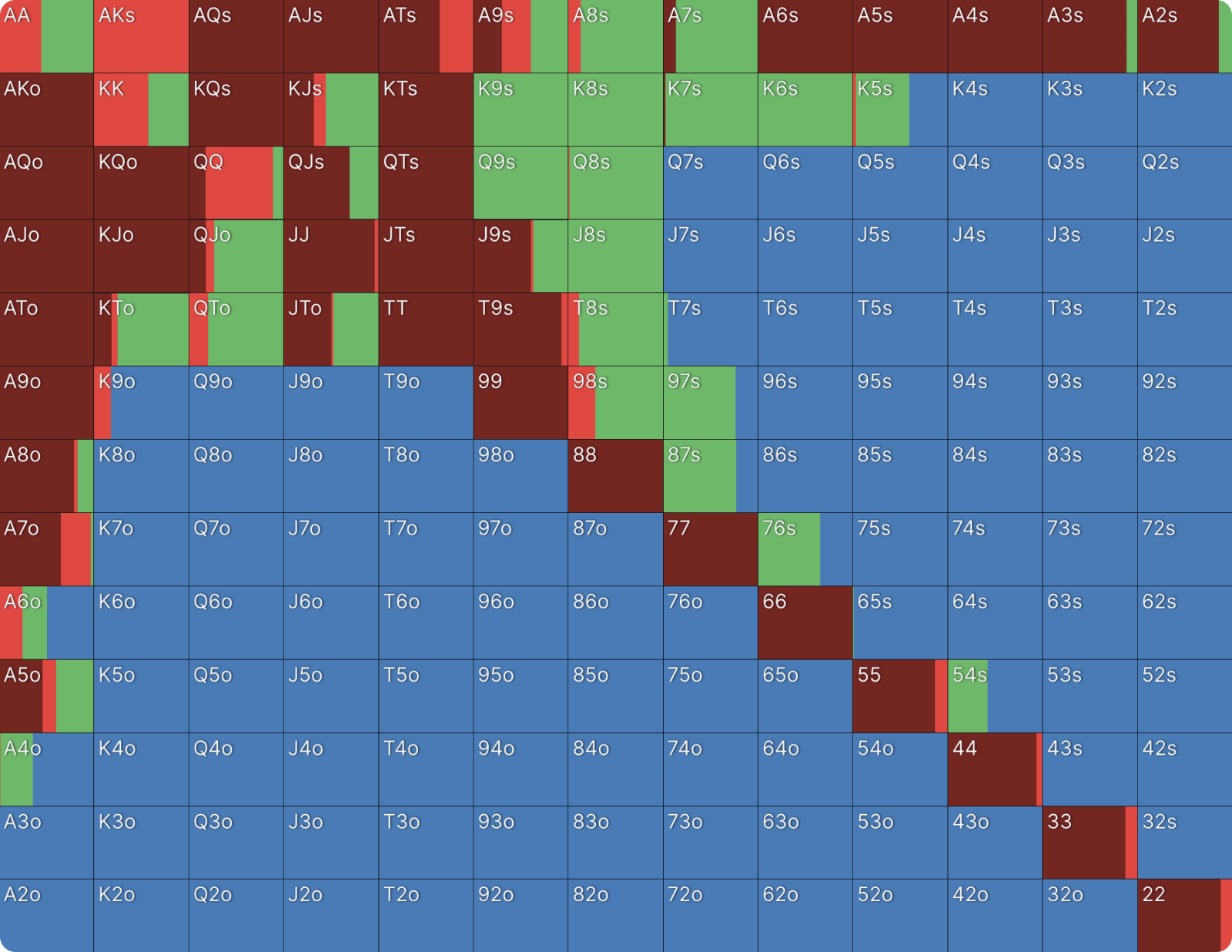 22 также ставит с высокой частотой по схожим причинам. Сет двоек — одна из самых сильных возможных комбинаций, и он хочет, чтобы банк увеличивался. Более того, 22 не блокирует потенциальные коллы. 22, как и QQ, целится в руки с валетом (J-x), которые он не блокирует. То же самое относится и к оверпарам. Вы можете увидеть дополнительные доказательства того, почему QQ и 22 ставят чаще других рук, посмотрев на другие комбинации в этом диапазоне.