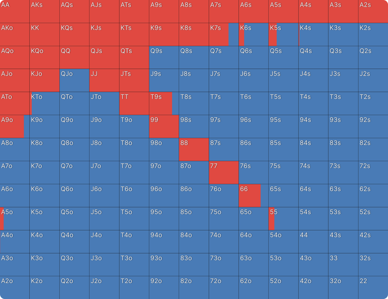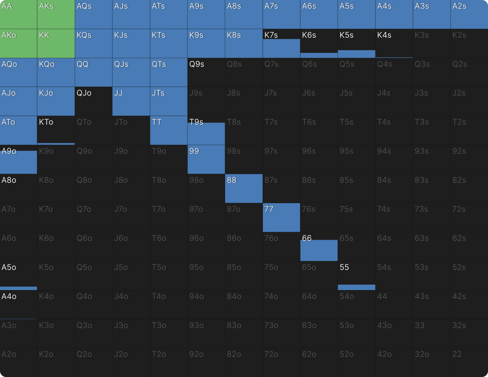 - Начнём с простого примера. Я анализировал префлоп-диапазоны для стека в 25bb и заметил следующую стратегию открытия для позиции баттон (BTN):