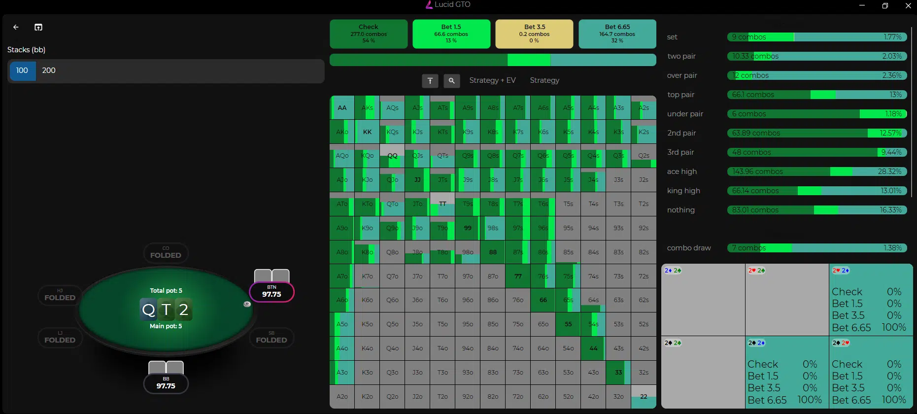 Хотя мы видим, что солвер иногда использует небольшую ставку (13%), вполне приемлемо (и, возможно, предпочтительнее) использовать здесь овербет. Давайте рассмотрим категории рук, которые я перечислил выше, так, как я бы их разыграл (и обратите внимание, что некоторые руки будут играть смешанную стратегию).