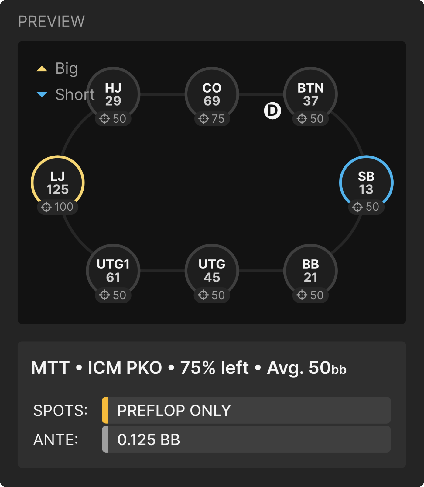 75% поля осталось в этом турнире. Все фолдят до CO, у которого стек равняется 69bb и баунти - $75. У BTN 37bb, у SB 13bb, а у BB 21bb. Все эти игроки за CO имеют баунти $50.