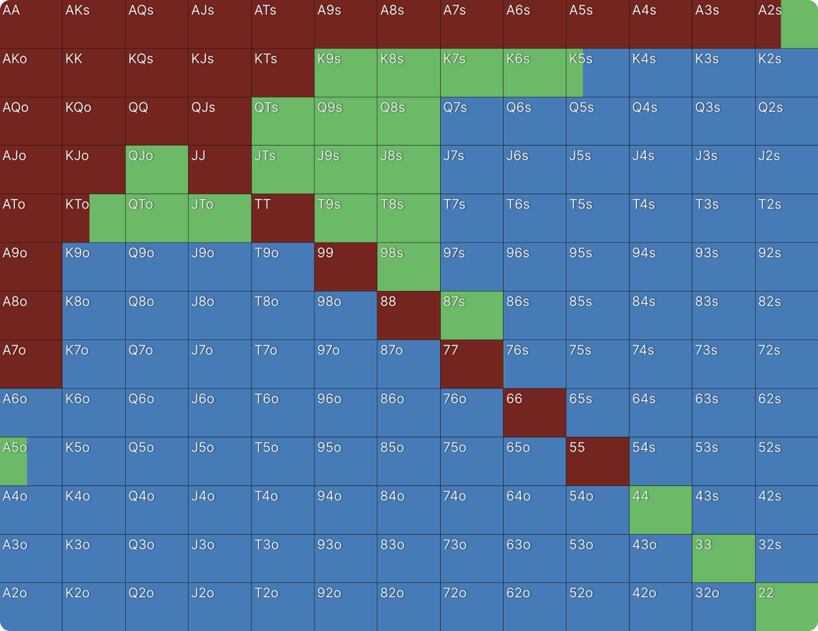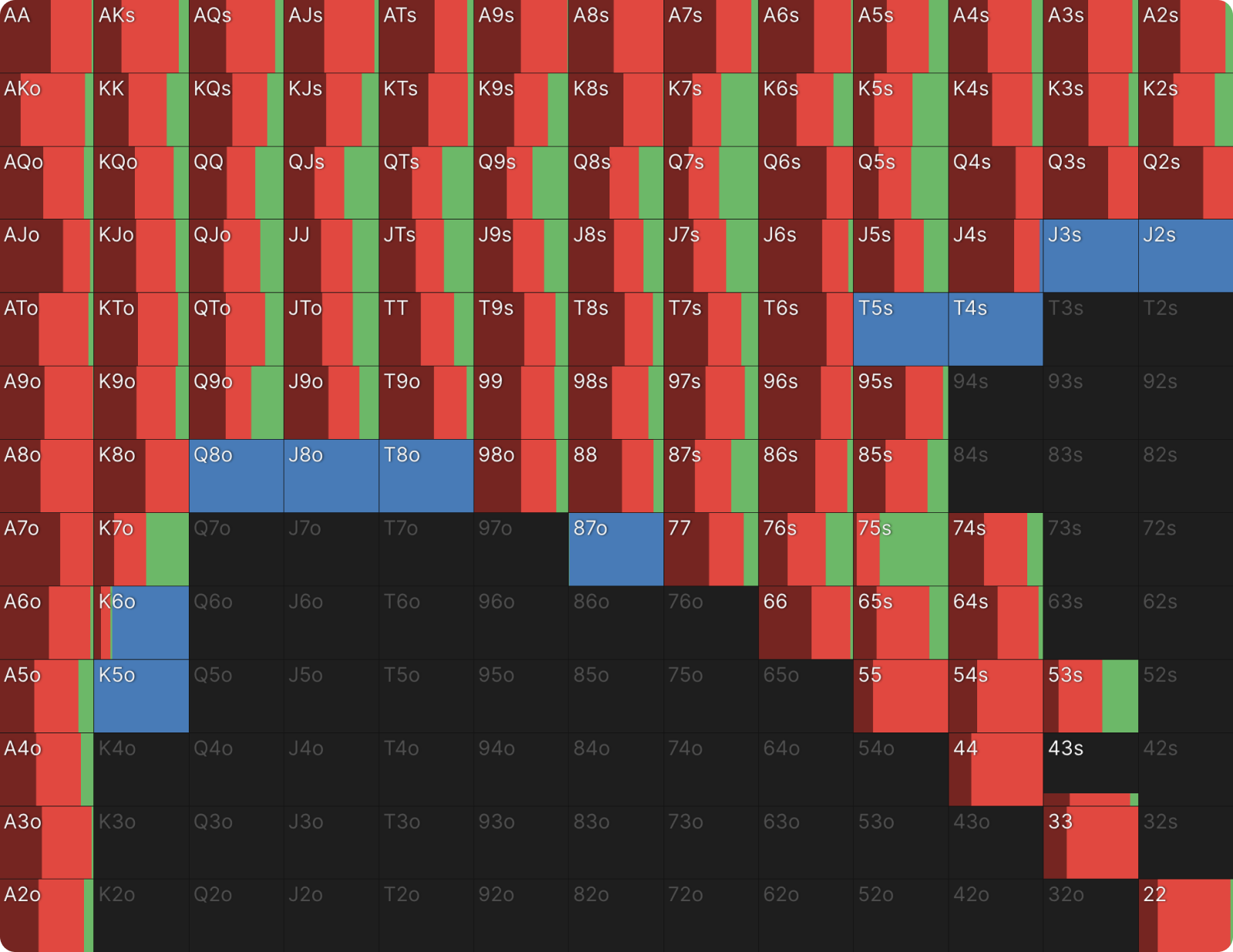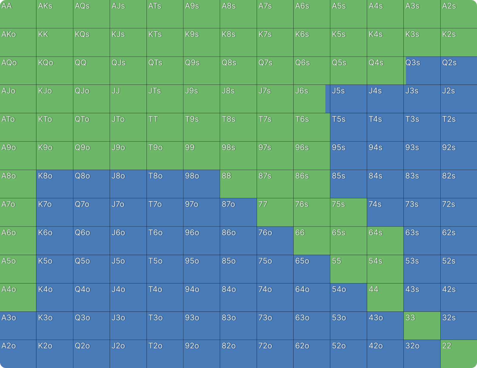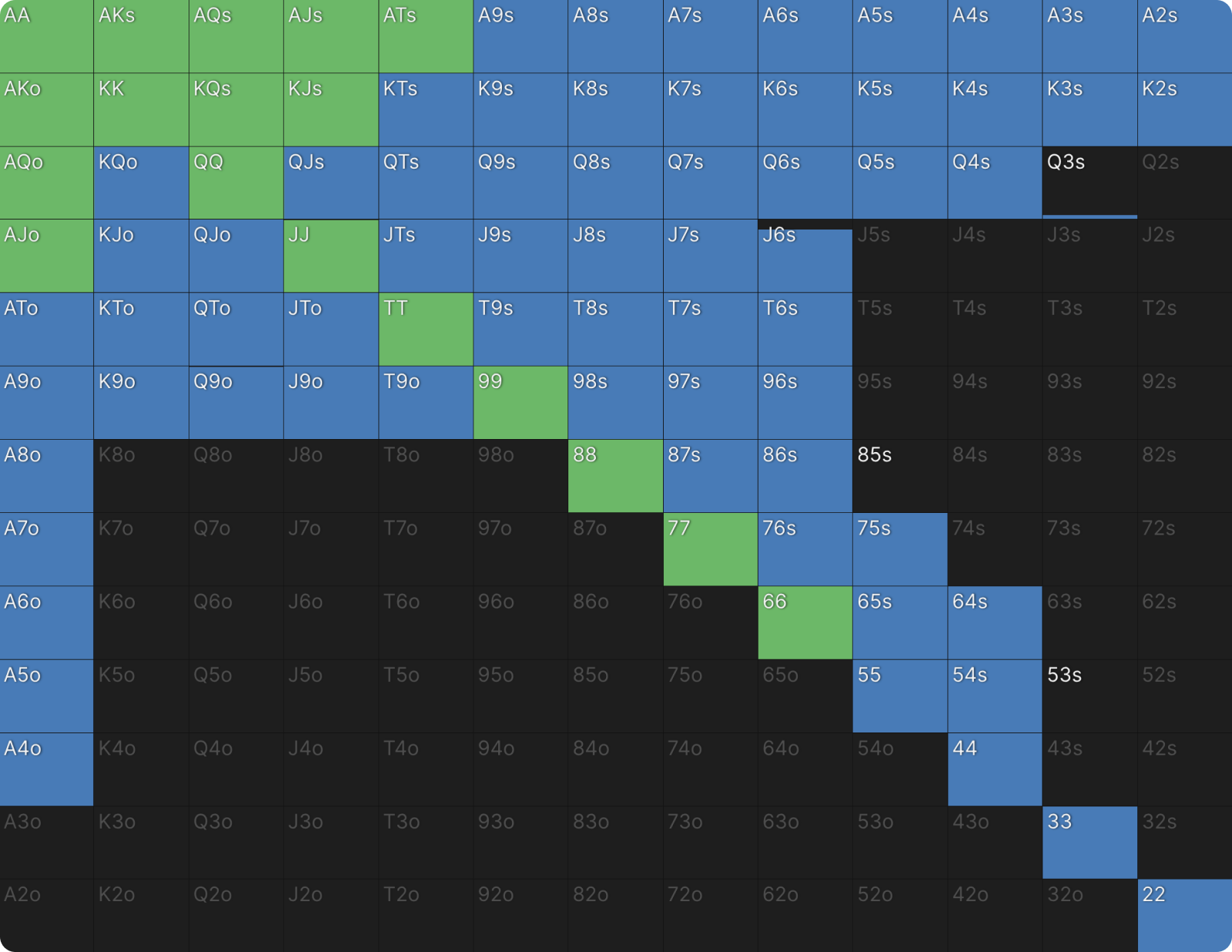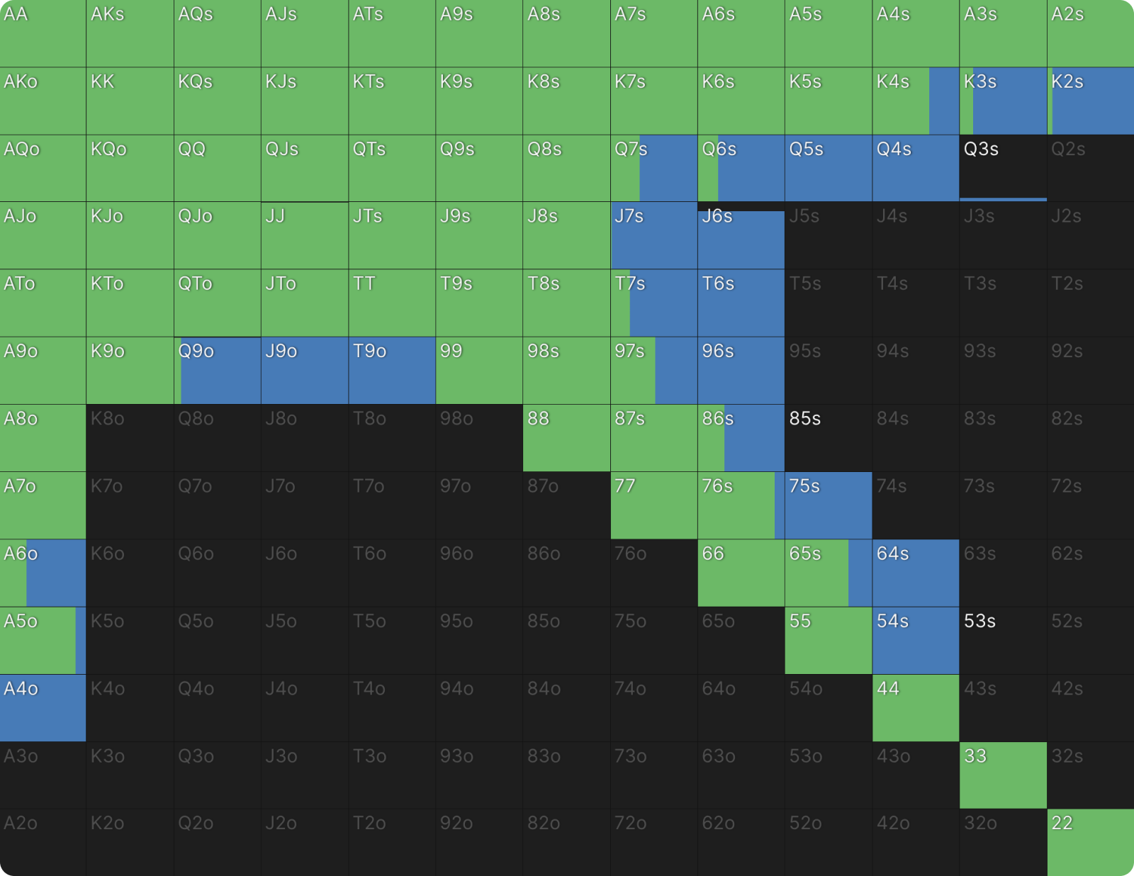 Это не какая-то ошибка или сбой настроек цветов для ставок в GTO Wizard. BTN продолжает 39% рук и когда он это делает, он только коллирует и при этом не повышает. Я никогда раньше не видел чистого диапазона флэта, подобного этому, но я видел очень похожие диапазоны в PKO раньше. Как только вы хорошо поймете формат, этот диапазон станет для вас понятным. Форма диапазона выглядит как диапазон открытия, если бы BTN открывался первым. Редко можно увидеть такие линейные диапазоны флэта в любом формате. Всегда полезно сравнивать диапазоны PKO с их ближайшим эквивалентом ChipEV.