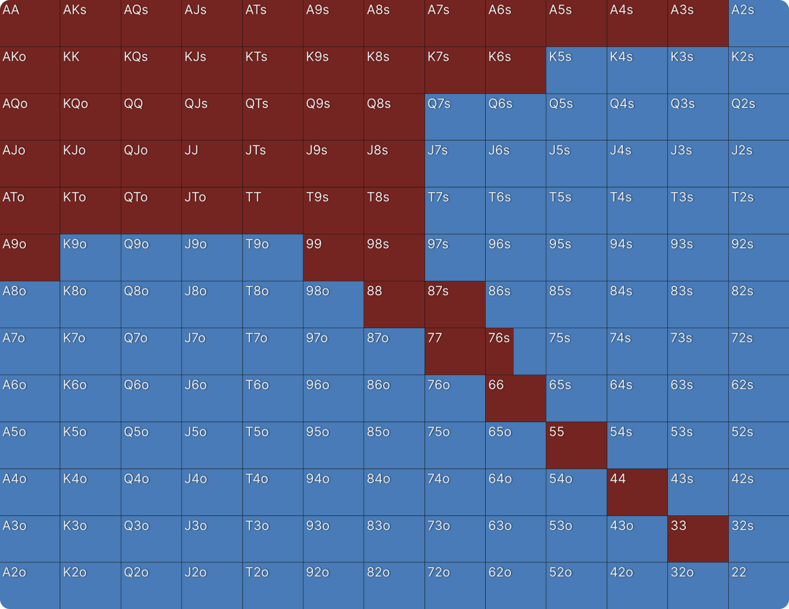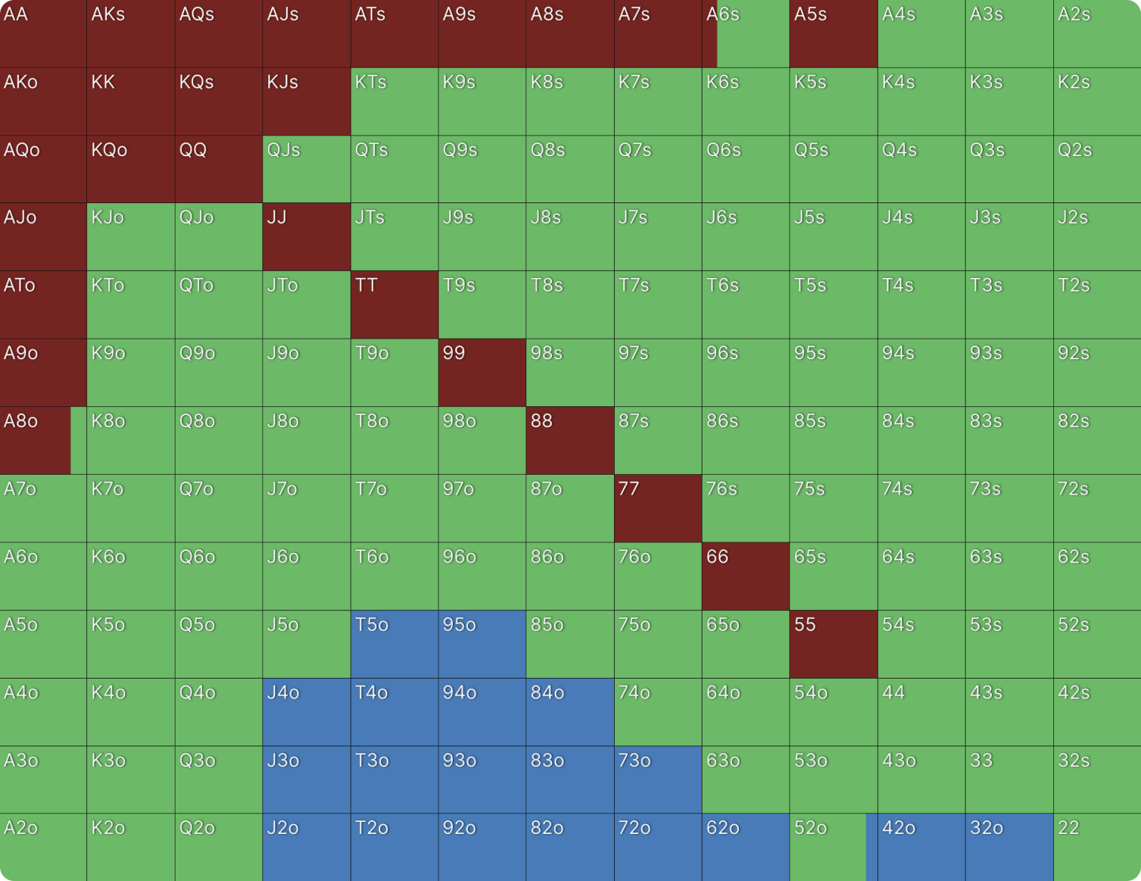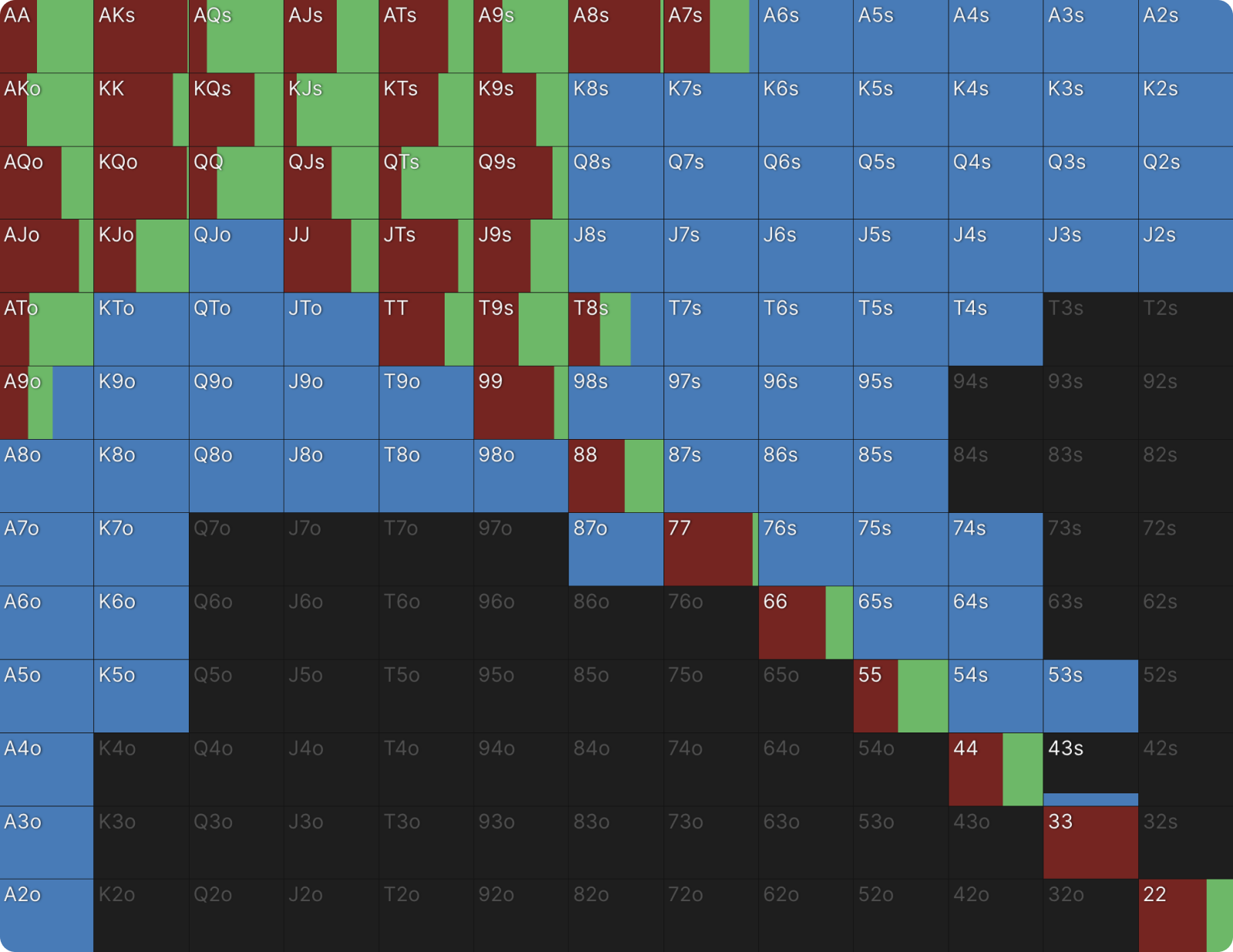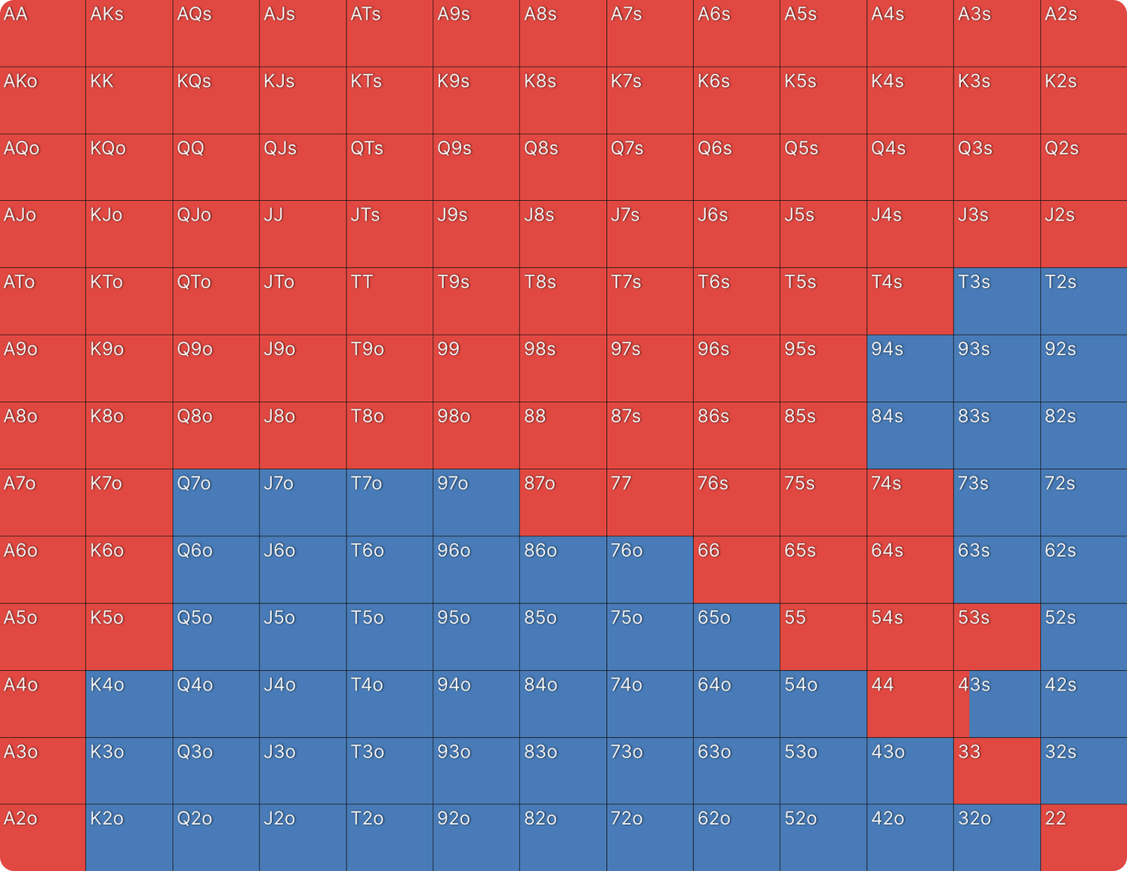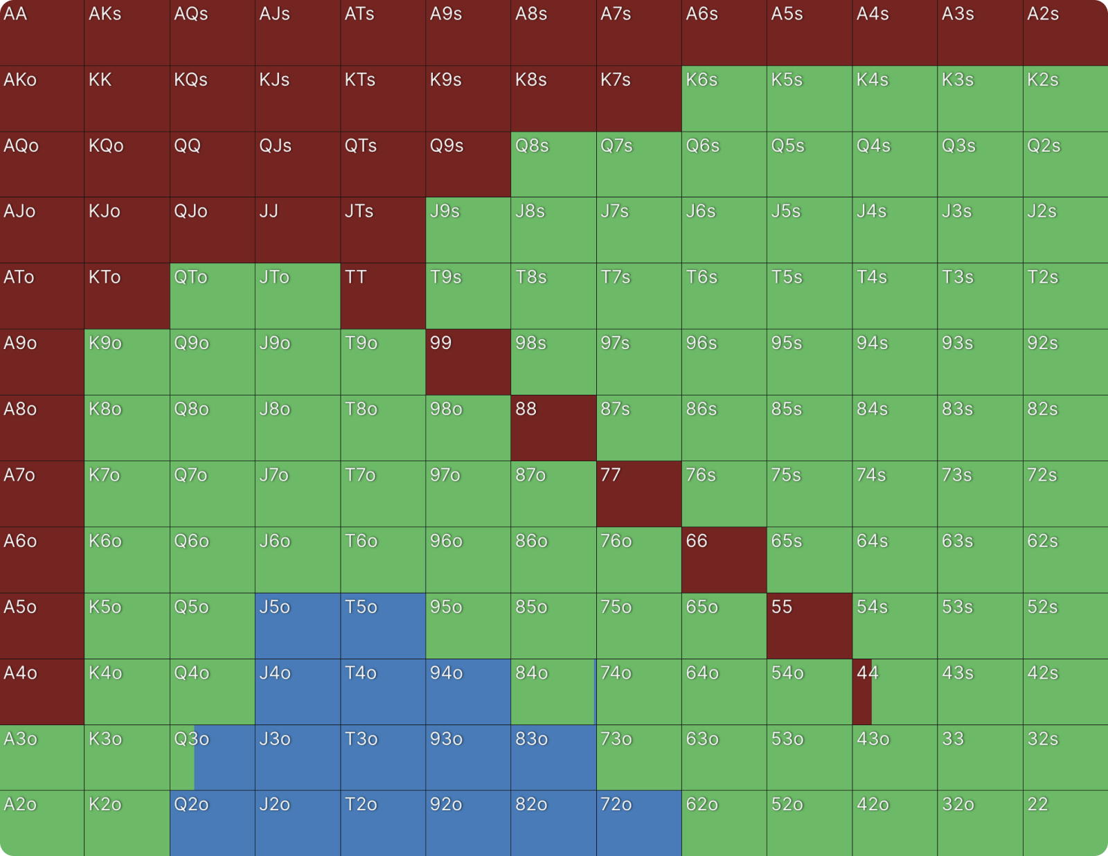 Это не какая-то ошибка или сбой настроек цветов для ставок в GTO Wizard. BTN продолжает 39% рук и когда он это делает, он только коллирует и при этом не повышает. Я никогда раньше не видел чистого диапазона флэта, подобного этому, но я видел очень похожие диапазоны в PKO раньше. Как только вы хорошо поймете формат, этот диапазон станет для вас понятным. Форма диапазона выглядит как диапазон открытия, если бы BTN открывался первым. Редко можно увидеть такие линейные диапазоны флэта в любом формате. Всегда полезно сравнивать диапазоны PKO с их ближайшим эквивалентом ChipEV.