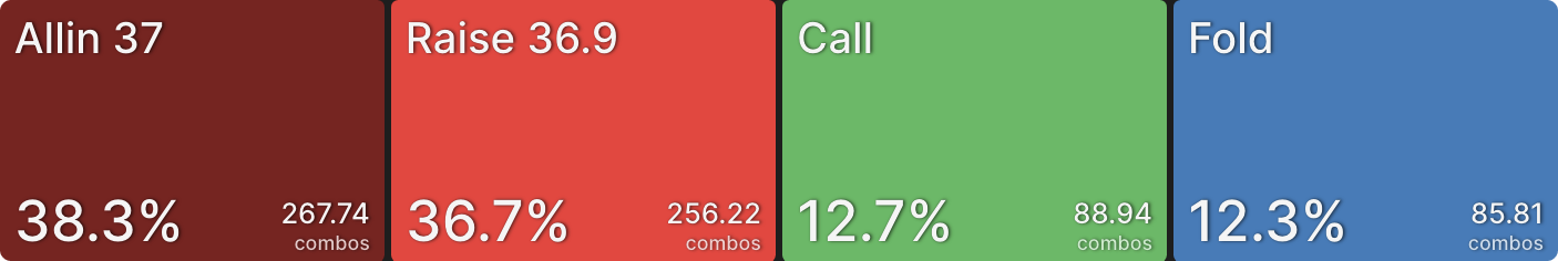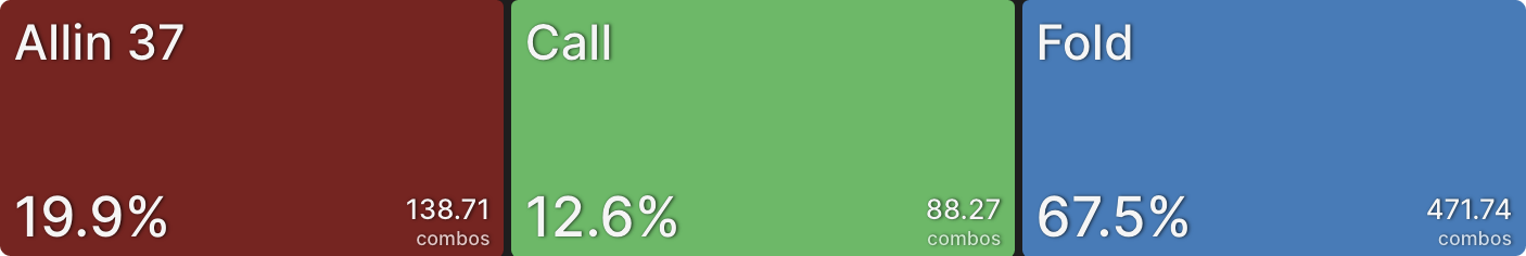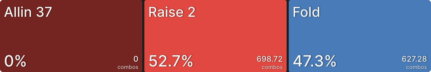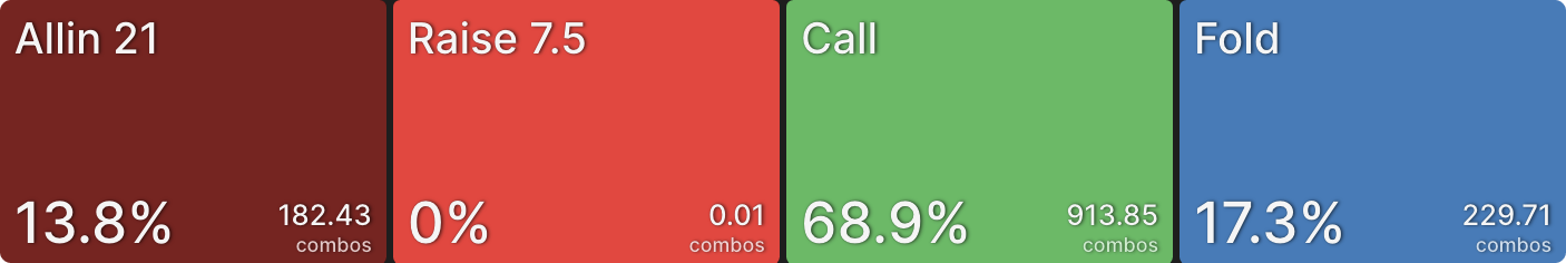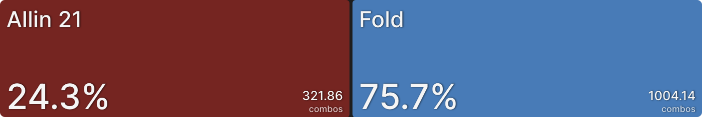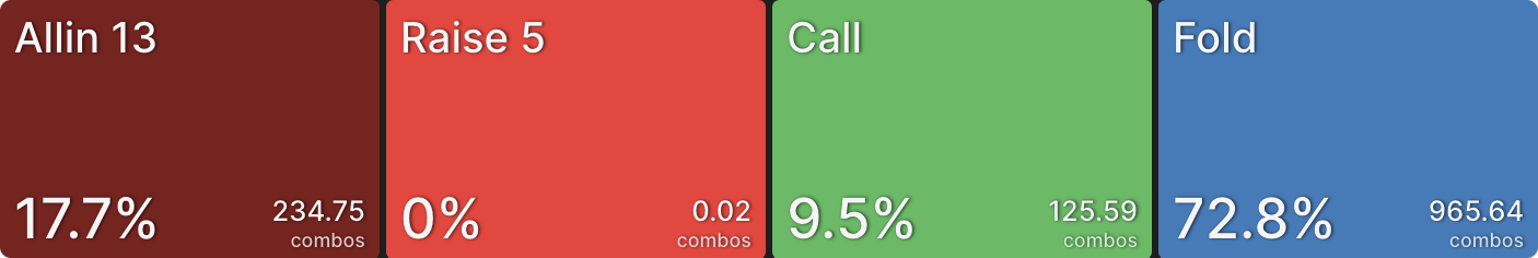 Аналогично, BTN сбрасывает гораздо больше в этом примере. Перспектива рисковать своей турнирной жизнью ради всего лишь одного баунти сместила его к фолду большую часть времени. Когда CO коллирует вместо пуша, это просто формальность, BTN пушит точно такой же диапазон, а затем CO коллирует.