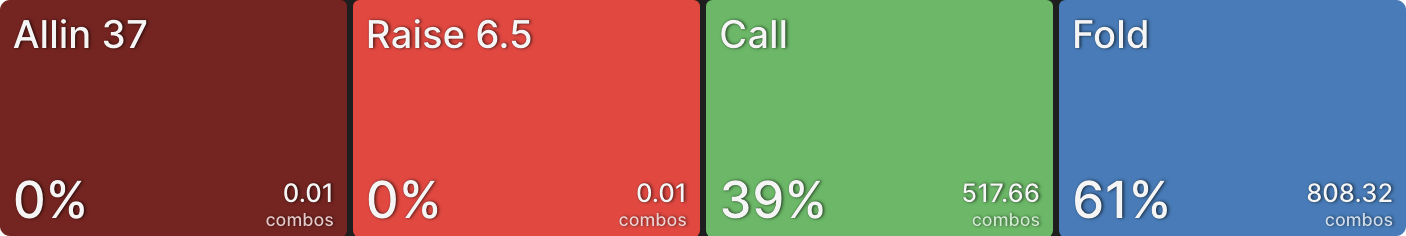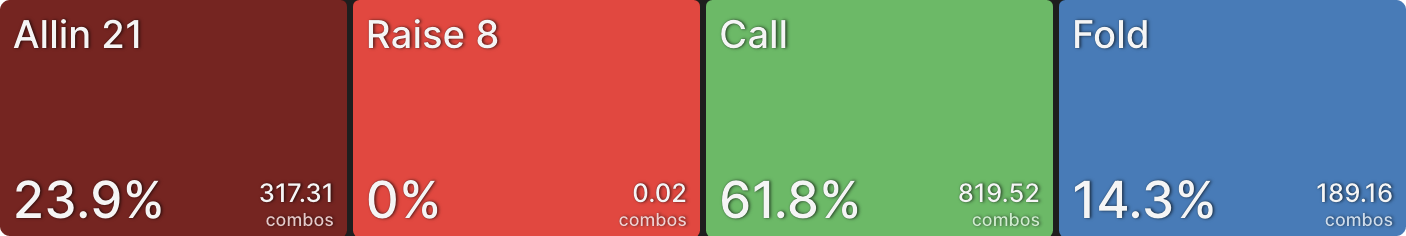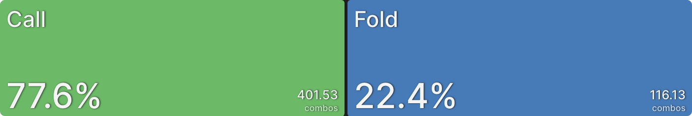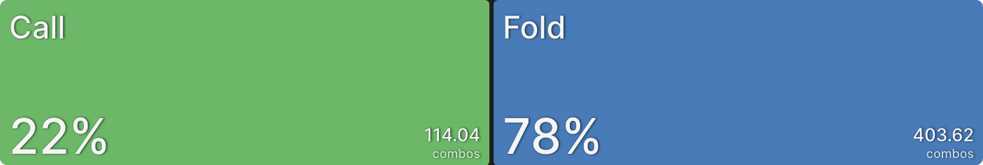 BTN использует плоский колл в 77,6% случаев. Важно отметить, что структура этого диапазона ориентирована на руки, эффективные против широких диапазонов в мультивей потах. Это в основном касается одномастных бродвейных рук, которые могут сохранить преимущество, попав в одну пару, также они имеют некоторые ауты при столкновении монстрами у оппонентов. Для новичков в PKO понимание этого диапазона коллов может быть сложным, так как он является одним из аспектов, делающих PKO очень динамичным форматом. Умение понимать ситуации, когда вы оказываетесь в мультивее и коллируете с такими руками, как Q9s, является ключевым навыком. Таким образом формат PKO не особенно подходит боязливым игрокам.