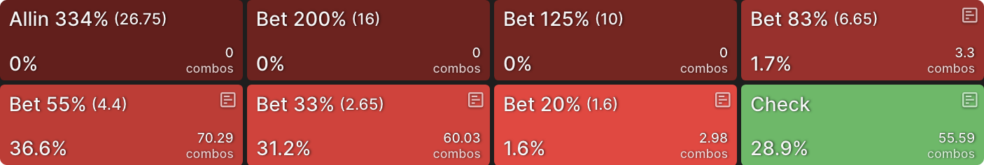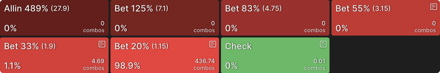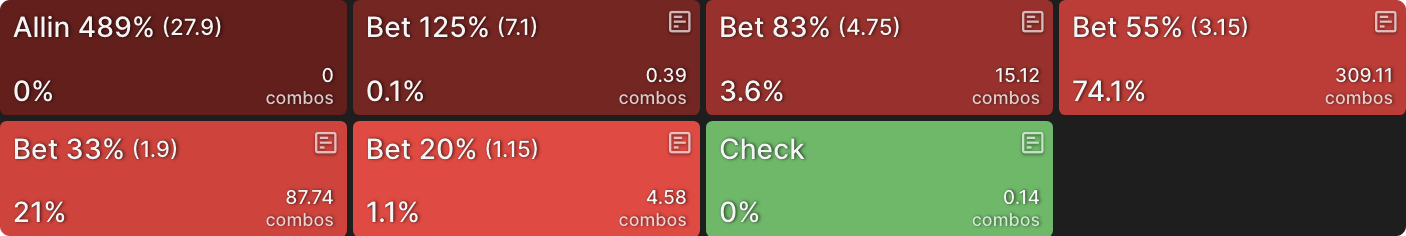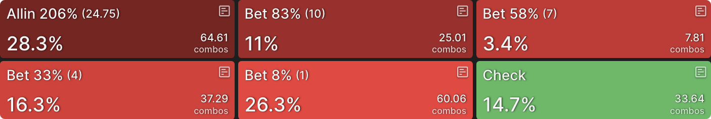 Стратегия солвера для CO все еще предполагает ставку с полным диапазоном, но теперь в основном используется больший размер ставки, так как гораздо больше рук CO хотят увеличить банк как можно сильнее:
