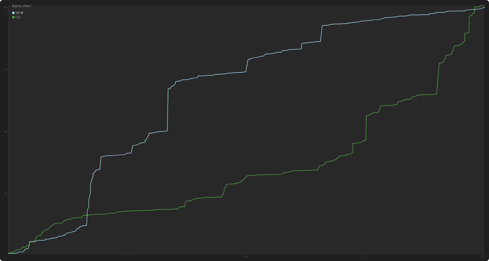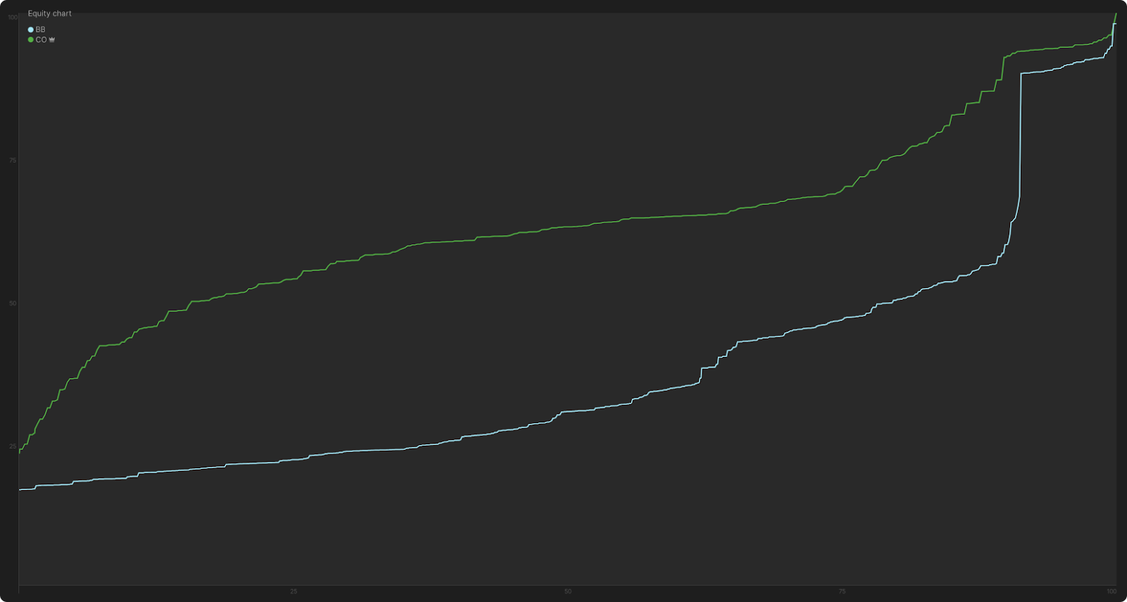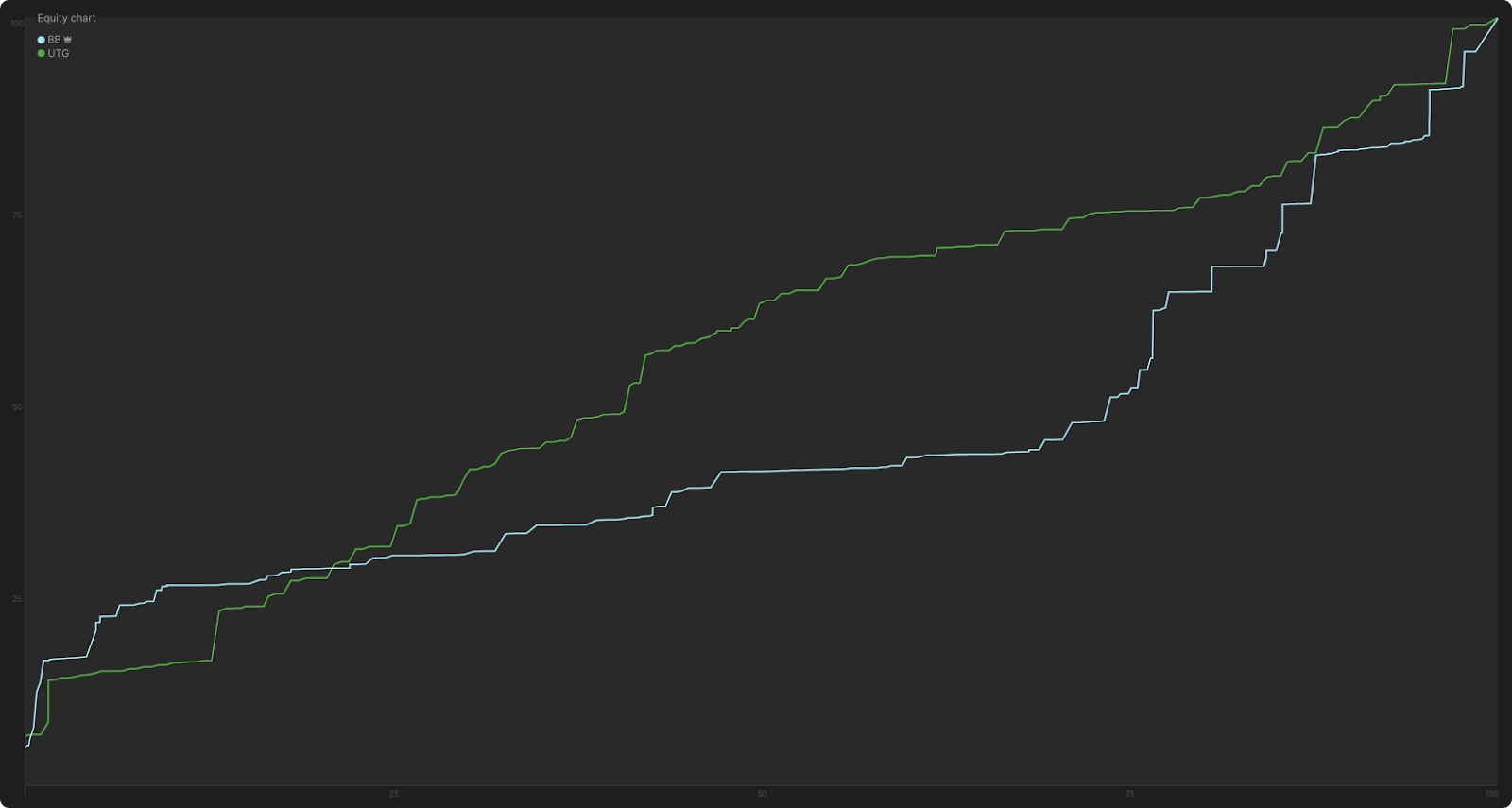 И снова решение — маленькая ставка! Как видно на этом “Manhattan-графике”, маленькие ставки BB (обозначенные светло-красным цветом) на тонкое велью в основном исходят от рук, которые имеют 50%–80% эквити: