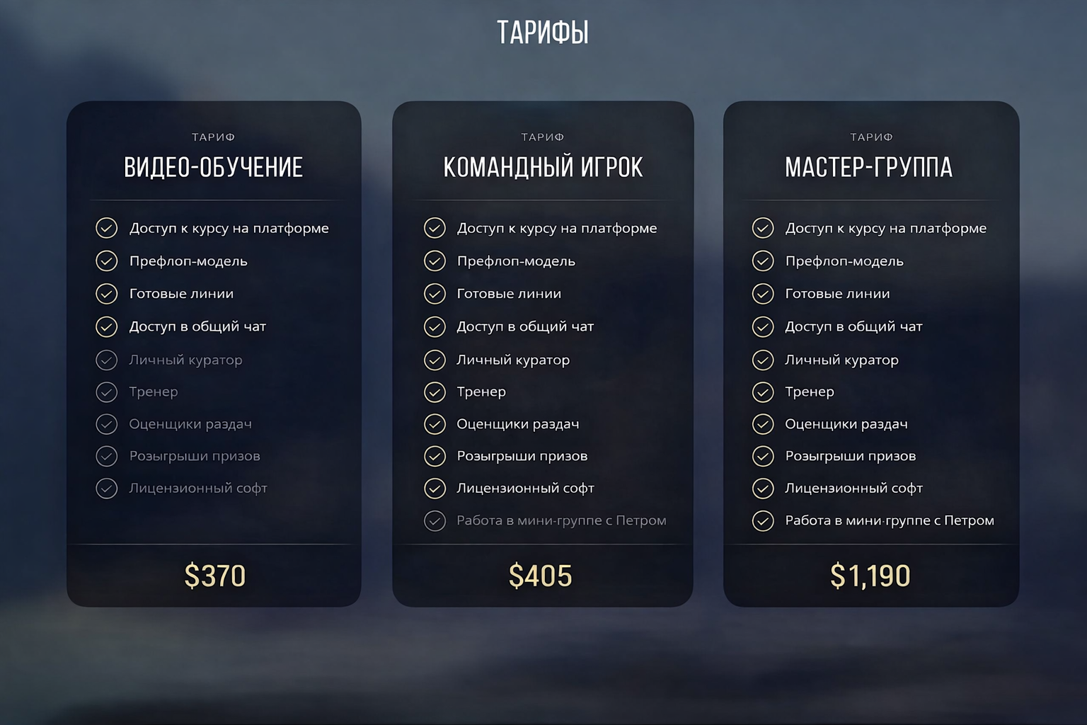Игрок получает структурированную стратегию игры, понимает, как работать с диапазонами, статистикой и софтом, умеет находить и исправлять ошибки в своей игре и выстраивает понятный план роста по лимитам без хаотичного обучения и догадок.